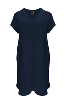 Deze donkerblauwe MAT jurk heeft een effen dessin en is vormgegeven met een V-hals. De korte mouwen en A-lijn pasvorm zorgen voor een licht en comfortabel draagcomfort. De losvallende pasvorm maakt deze damesjurk, model 8501,7127, ideaal voor een casual look. Dit kledingstuk is uitgevoerd met een afgeronde onderkant.Pasvorm en Stijladvies
