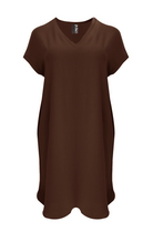 De MAT JURK 8501,7127 Bruin is een casual jurk met een effen dessin. Dit losvallende dameskledingstuk is gemaakt van 100% polyester en voelt soepel en comfortabel aan op de huid. Het model is voorzien van een V-hals en heeft korte mouwen. De minimalistische stijl maakt deze bruine jurk van MAT kleding een fijne basis voor jouw dagelijkse look.Pasvorm en Stijladvies