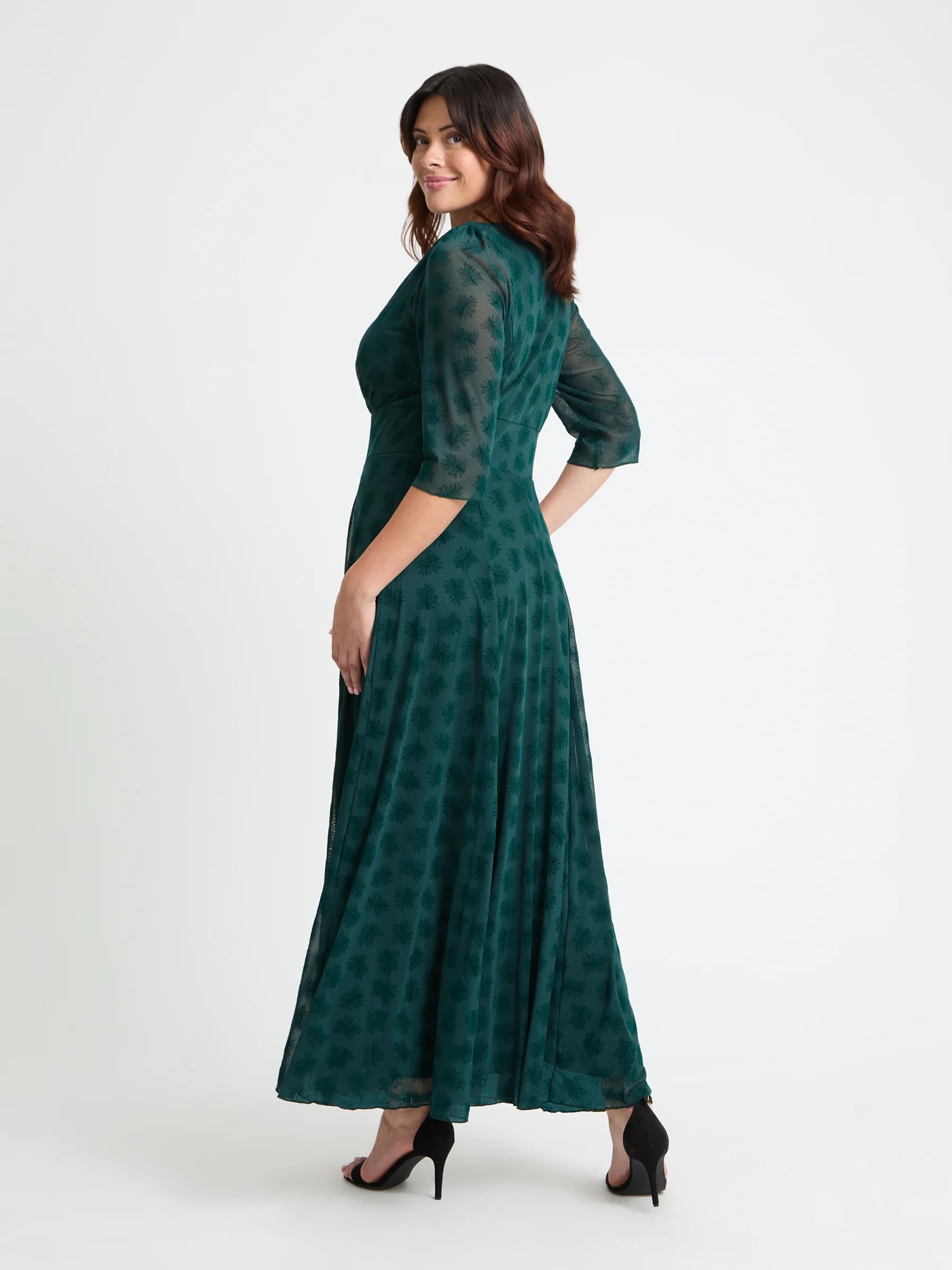 Deze donkergroene maxi-jurk van Scarlett & Jo heeft een overslag V-hals en doorschijnende driekwart mouwen. De stof is voorzien van een subtiel flock dessin in een bladmotief. De A-lijn pasvorm creëert een vloeiende beweging rondom de benen. De taille is hoog geplaatst en geplooid. Dit is een stijlvolle lange jurk die past bij een casual en open levensstijl, ook als je op zoek bent naar kleding voor grote maten.