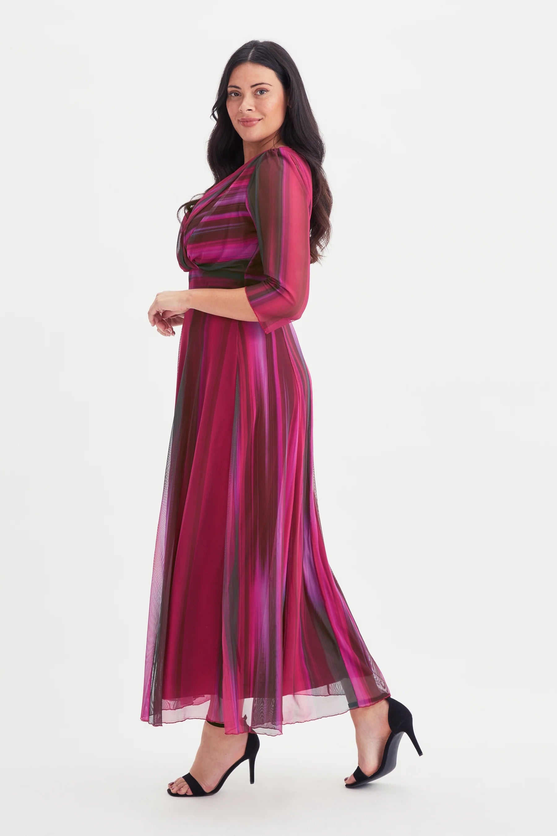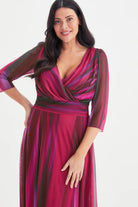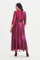 Deze lange damesjurk van Scarlett & Jo heeft een WINEIKAT dessin in verschillende tinten rood en paars. De Scarlett & Jo jurk is uitgevoerd met een overslag V-hals en driekwartmouwen. De mouwen zijn gemaakt van een semi-transparante stof. Het ontwerp is voorzien van een brede, geplooide tailleband die de wikkelstijl van de top benadrukt. De soepel vallende maxi-rok zorgt voor een elegante uitstraling. Deze feestelijke damesjurk is een opvallende keuze voor momenten waarbij je een verzorgde look wil.