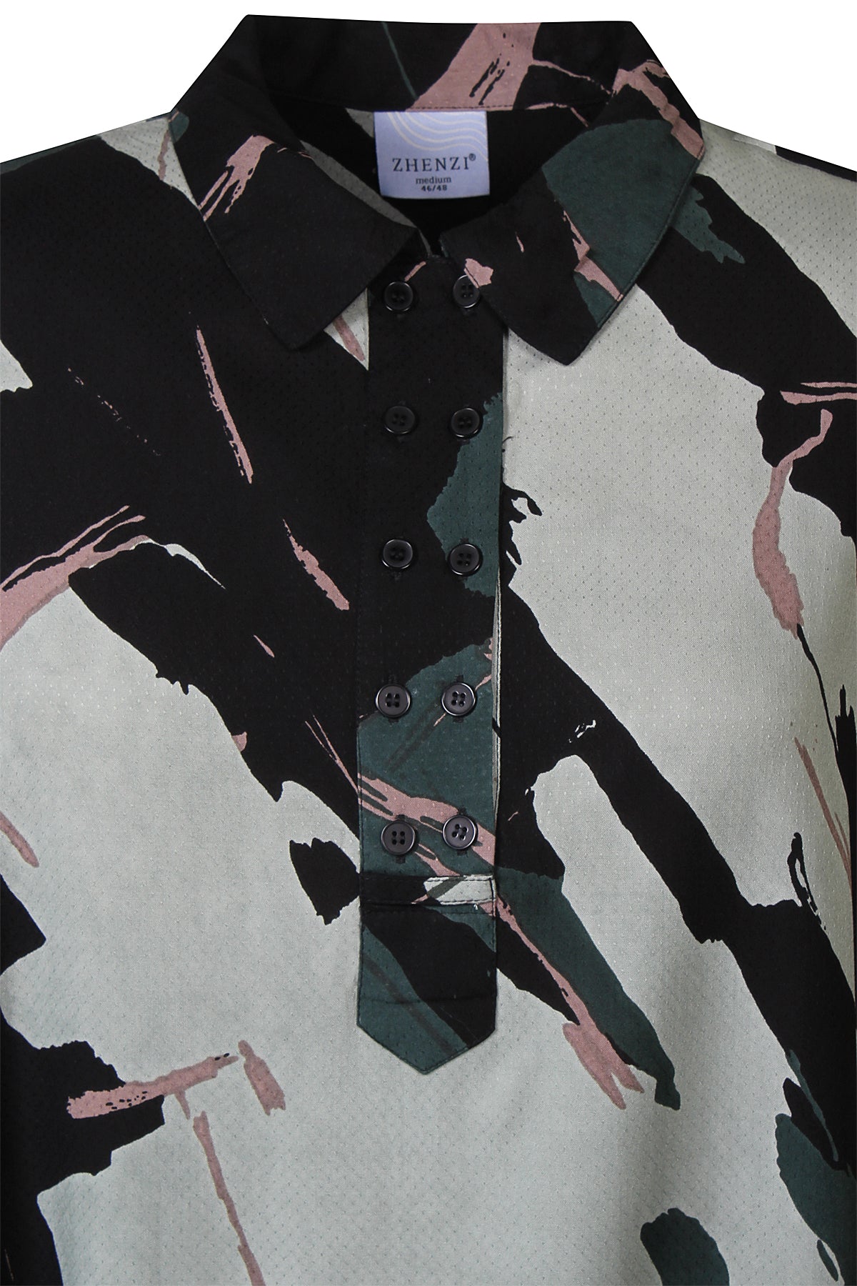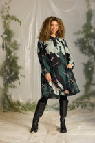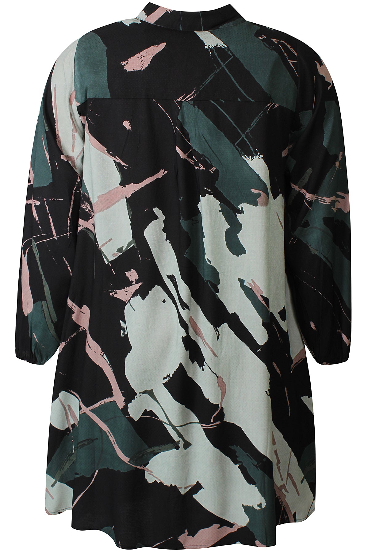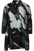 Deze Zhenzi jurk is uitgevoerd in een donkergroene kleurstelling met een abstracte print. De A-lijn jurk heeft een klassieke overhemdkraag en is voorzien van een functionele knoopsluiting tot halverwege de borst. Dit casual kledingstuk heeft driekwart mouwen met een elastische manchet en praktische steekzakken aan de zijkanten. Het tuniekmodel valt boven de knie.Pasvorm en Stijladvies