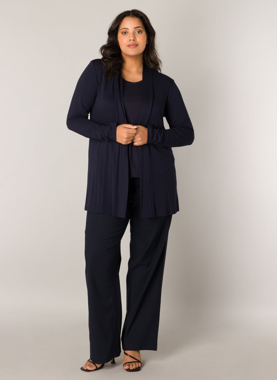 Dit lange dames vest van Base level curvy is uitgevoerd in een diepe donkerblauwe kleur. Het Base level curvy Vest 7000023 kenmerkt zich door de vloeiende, open voorzijde en de lange mouwen. Het kledingstuk valt middellang en heeft een recht silhouet dat ontworpen is als een comfortabel, casual laagje. Door de effen kleur en het simpele ontwerp is dit vest van Base level curvy een neutrale en veelzijdige toevoeging aan je dagelijkse kledingcollectie.