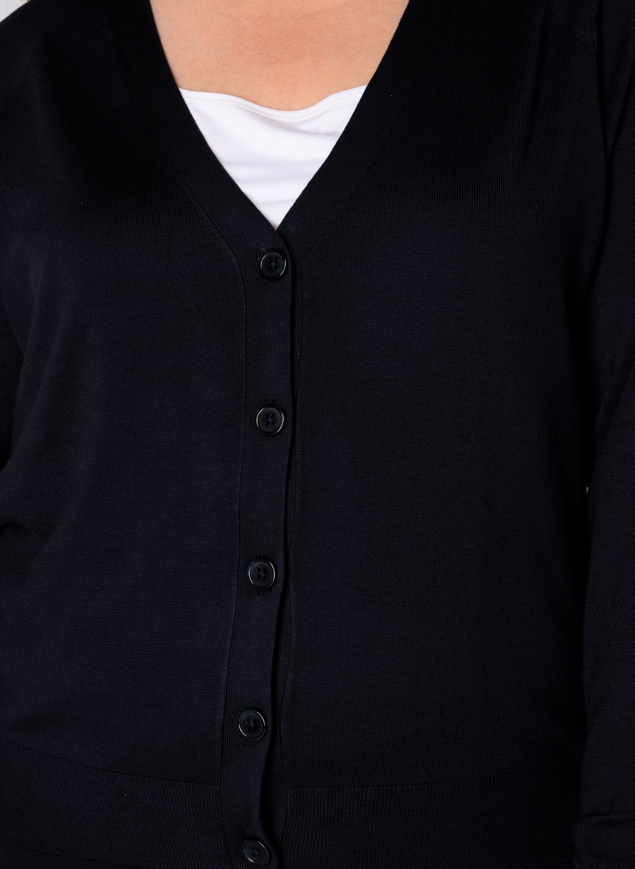 Dit donkerblauwe gebreide vest van Base level curvy heeft een effen dessin en is voorzien van een V-hals. Het kledingstuk sluit aan de voorzijde met een verticale rij van vijf ronde knopen. Dit Base level curvy damesvest is een casual toevoeging aan je garderobe. De lange mouwen en de fijne tricot maken dit vest een comfortabel en veelzijdig kledingstuk.Pasvorm en Stijladvies