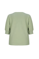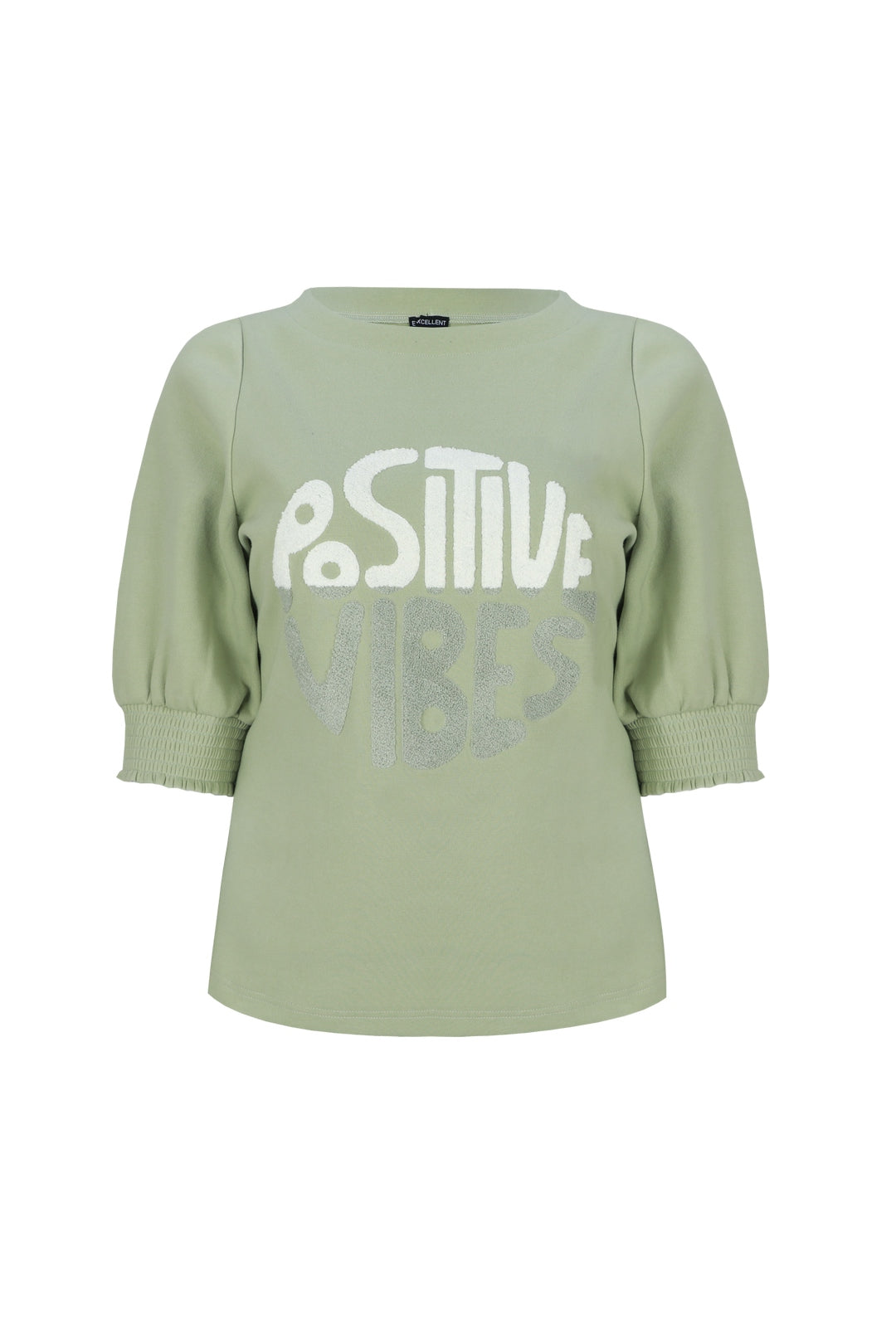 Deze lichtgroene trui van het merk Exxcellent is een casual sweater met een ronde hals en driekwart mouwen. De voorkant is voorzien van de opvallende opdruk "POSITIVE VIBES" in een combinatie van wit en zilverkleurig lettertype. De mouwen kenmerken zich door gesmokte, elastische boorden bij de manchet. Dit geeft de trui een comfortabele pasvorm rond de armen. Deze trui is een prettig bovenstuk voor een casual en toegankelijke look in je dagelijkse kledingkeuze.
