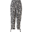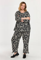 De Gozzip Broek G261030 Zwart/Wit is een comfortabele damesbroek met een all-over botanisch dessin in zwart en crème/wit. Deze soepelvallende printbroek van Gozzip heeft een hoge, elastische tailleband die zorgt voor optimaal draagcomfort. De pijpen zijn recht en vallen tot op de enkel. Onderaan de pijpen zit een decoratief strikdetail. Dit casual kledingstuk met levendige print is perfect voor dagelijks gebruik.Pasvorm en Stijladvies