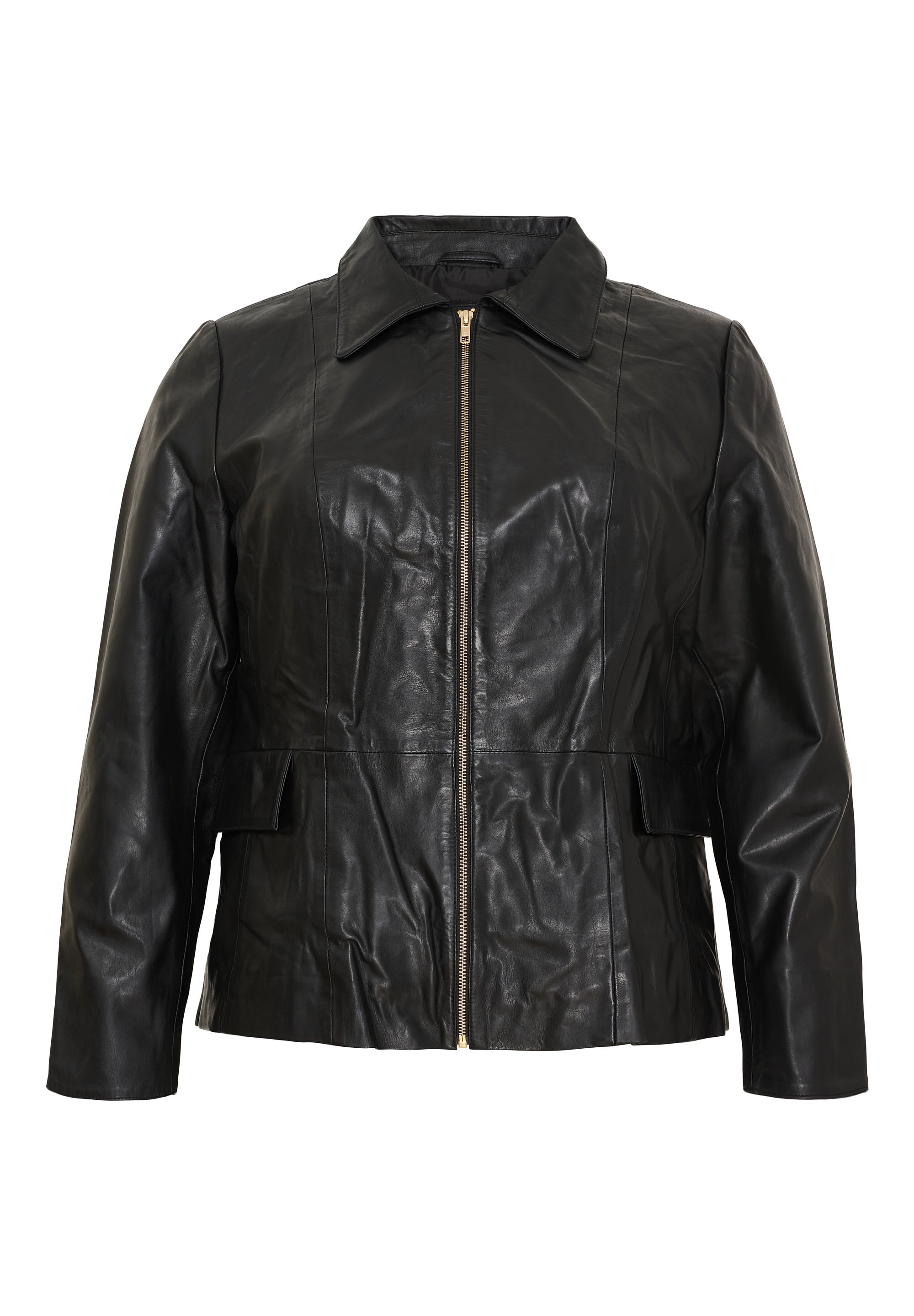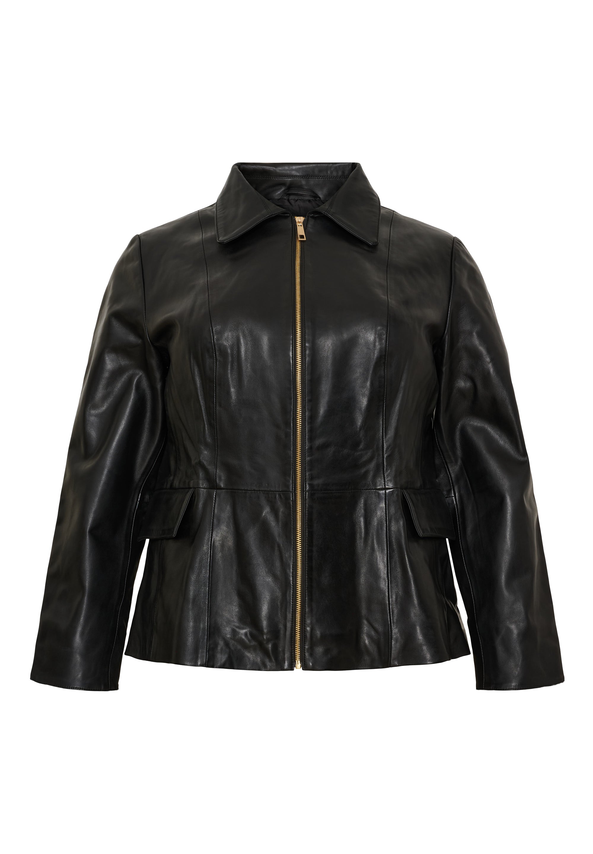 Dit zwarte leren jack van No.1 by Ox heeft een klassieke omgeslagen kraag en sluit aan de voorzijde met een doorlopende goudkleurige rits. De voorzijde is voorzien van twee opgestikte klepzakken op heuphoogte. De verticale stiknaden aan de voorkant en rug zorgen voor een gestructureerd silhouet in dit kledingstuk uit de collectie voor grote maten.