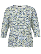 Dit Via Appia Due T-shirt in salbei multicolor heeft een casual pasvorm met een ronde hals. Het kledingstuk is uitgevoerd in een fijngebreide jerseystof en is voorzien van driekwart mouwen. Dit damesshirt toont een doorlopend geometrisch dessin met symmetrische elementen in blauw- en groentinten. Het Via Appia Due shirt heeft een rechte zoom, wat zorgt voor een comfortabel draagcomfort.