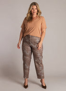 Deze bruine pantalon van Yest Curve, model A006115, is een rechte broek in een moderne kortere lengte. De lange damesbroek is voorzien van een all-over slangenprint dessin in diverse aardetinten. De broek sluit aan de voorzijde met een rits en een haaksluiting. Deze pantalon is makkelijk te stylen voor een casual en toegankelijke look.Pasvorm en Stijladvies