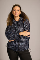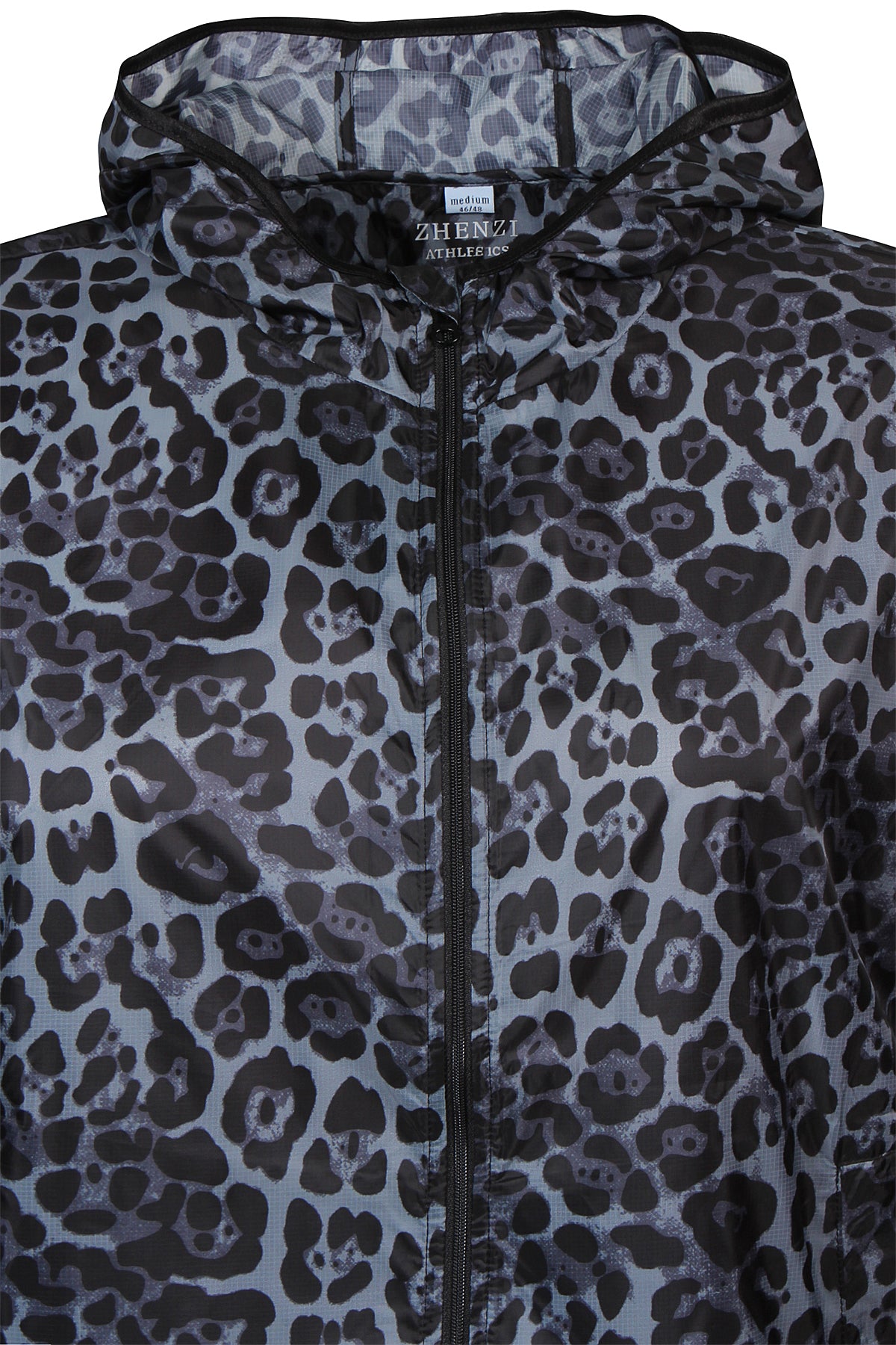 Dit Zhenzi jack met luipaarddessin is uitgevoerd in donkere tinten zwart en grijs. Deze windbreaker sluit aan de voorzijde met een doorlopende ritssluiting. Het lichte sportjasje is voorzien van een capuchon en lange mouwen met elastische manchetten. Aan de onderzijde bevindt zich een trekkoord om de pasvorm aan te passen. Op de rug is de witte opdruk 'ATHLETICS' zichtbaar. Je bergt je kleine spullen veilig op in de twee ritszakken. Dit jack is een moderne toevoeging aan je sportieve kledingcollectie.