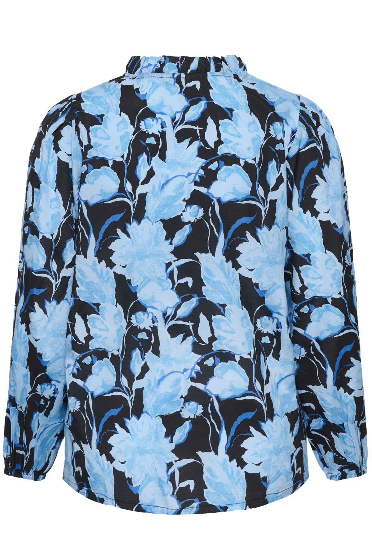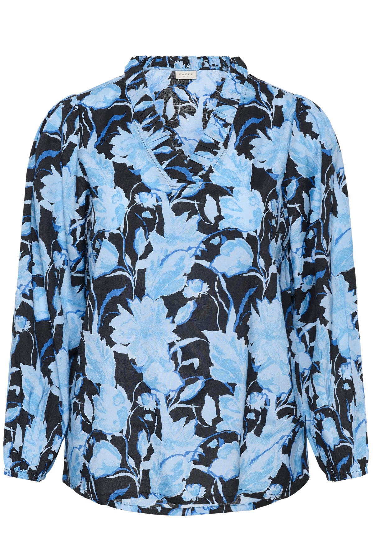 Deze gebloemde blouse van Kaffe curve toont de Blue Snake Flower print, een dessin dat bestaat uit grote blauwe bloemen op een zwarte basis. De top heeft lange mouwen en is aan de voorzijde voorzien van een v-hals met een verfijnde ruche langs de halslijn. De manchetten van dit bovenstuk zijn afgewerkt met een enkele knoopsluiting. Dit casual bovenkledingstuk is ontworpen om licht en comfortabel te dragen.