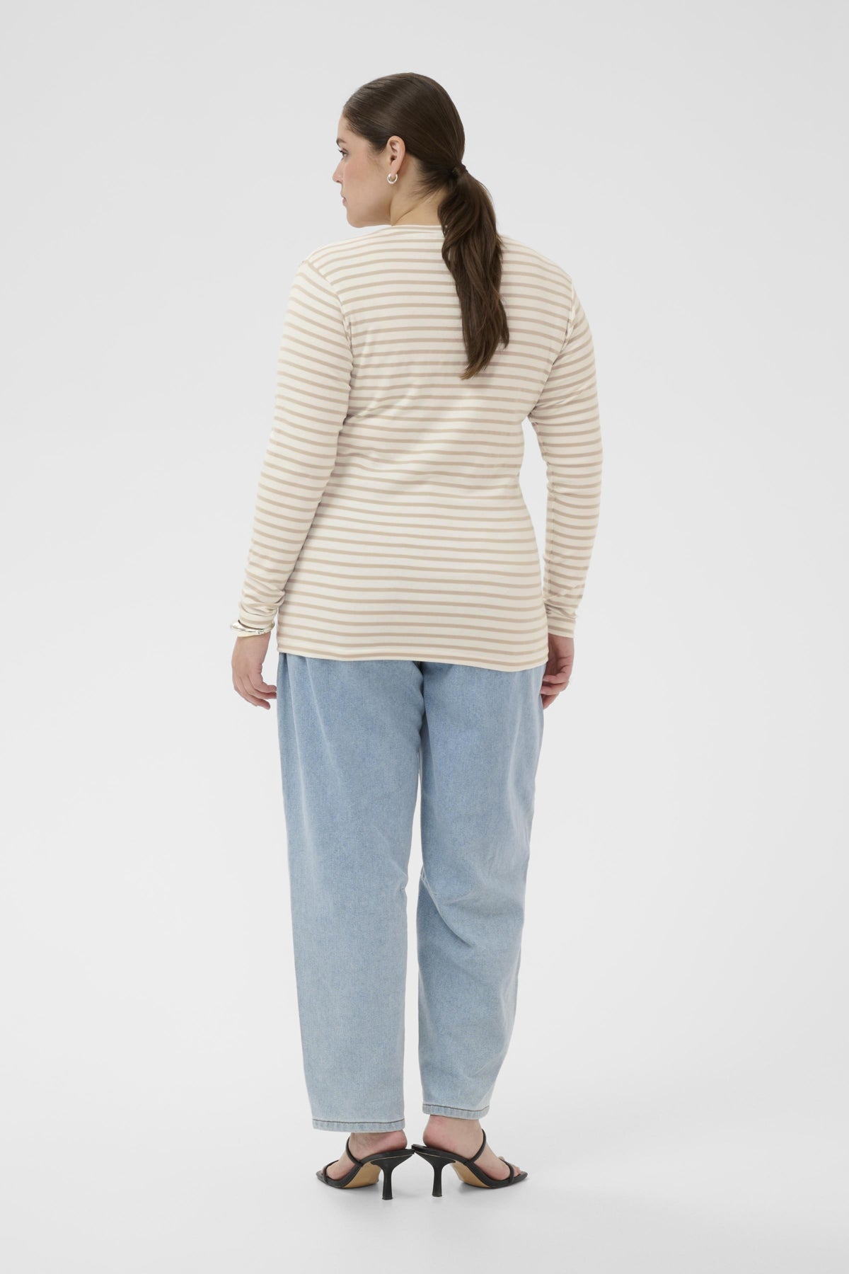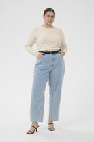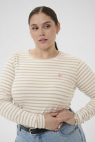 Wil je dit gestreepte shirt voor grote maten casual stylen? Combineer deze longsleeve top met een lichte wide-leg spijkerbroek of een effen kleur broek voor een ontspannen, toegankelijke look. Bekijk de collectie van Kaffe curve voor meer bijpassende items.