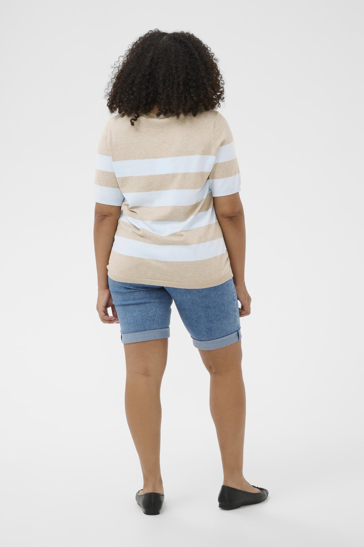 De Kaffe curve Trui 10582914 is een gebreide top met korte mouwen. Deze zomertrui kenmerkt zich door een horizontaal streepdessin in de kleuren Feather Mel (beige) en lichtblauw. De gebreide top heeft een klassieke ronde hals en een rechte snit. De korte mouwen en de onderkant zijn afgewerkt met een fijne ribboord, wat zorgt voor een nette afwerking. De samenstelling van 80% viscose en 20% nylon maakt dat deze Kaffe curve trui licht en comfortabel draagt.