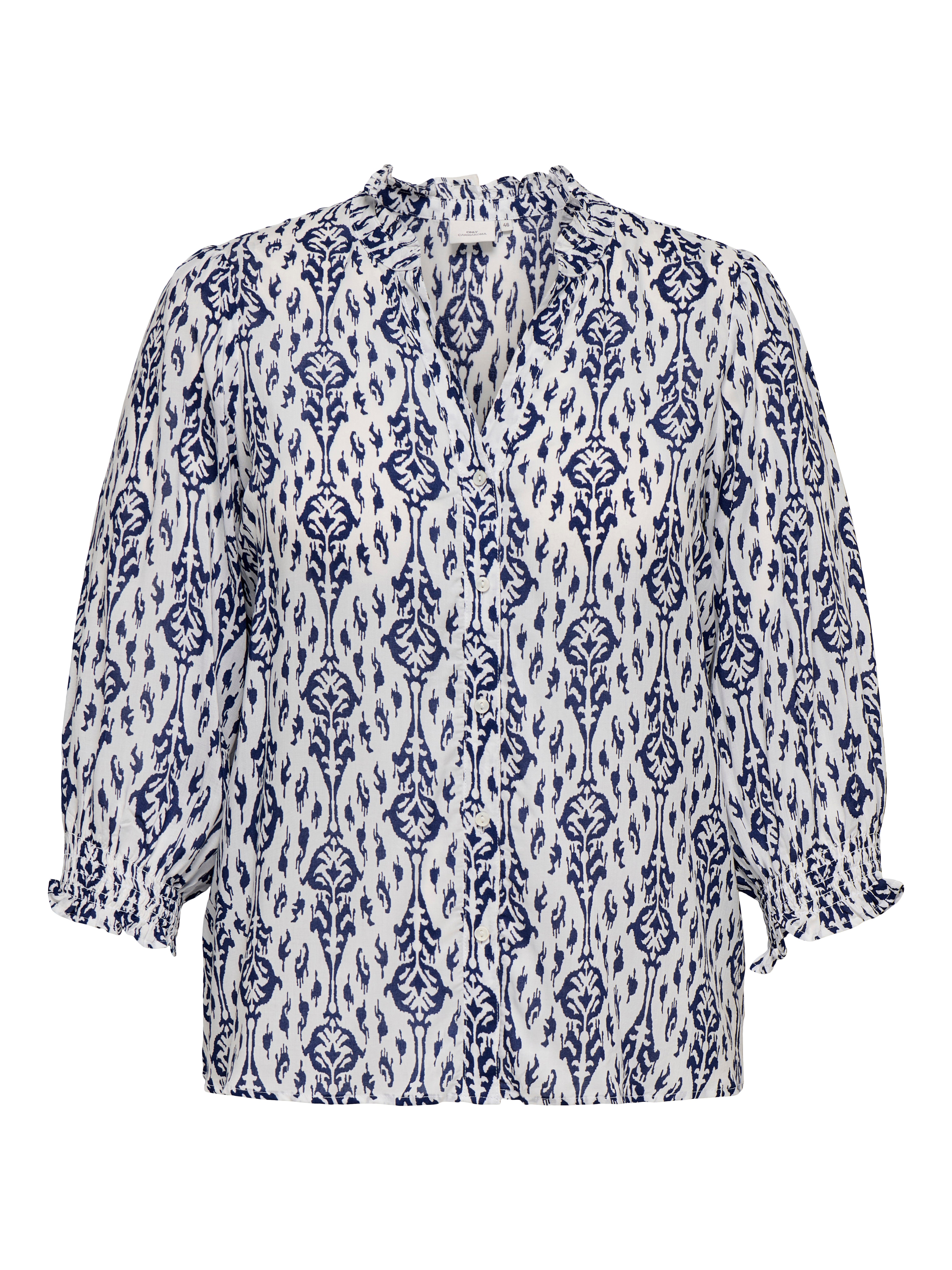 Deze Only Carmakoma blouse is uitgevoerd met een grafische print in de kleurencombinatie night sky en wit. Het item heeft een v-hals met ruffelkraag en een verticale knoopsluiting aan de voorzijde. De driekwart mouwen eindigen in elastische manchetten met ruches. Je draagt met deze top van Only Carmakoma een luchtig kledingstuk van geweven viscose.
