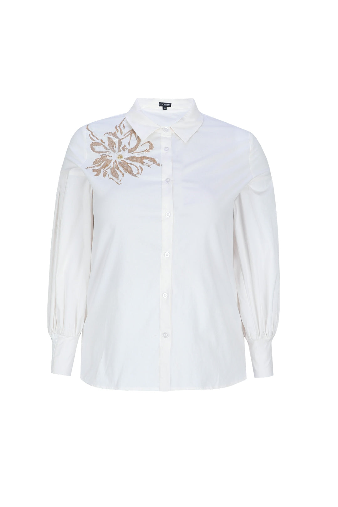 Deze roomwitte overhemdblouse van Exxcellent is voorzien van een klassieke kraag en een sluiting met knopen over de gehele voorzijde. Het kledingstuk heeft een opvallend goudkleurig, abstract borduursel op de linker schouder. De lange mouwen zijn ingezet met plooien en afgewerkt met manchetten, wat de pasvorm van deze damesblouse een moderne touch geeft.