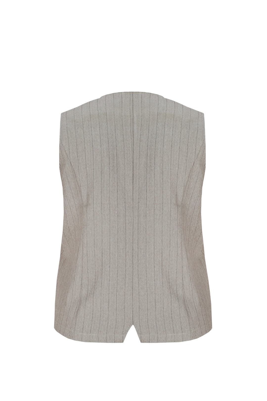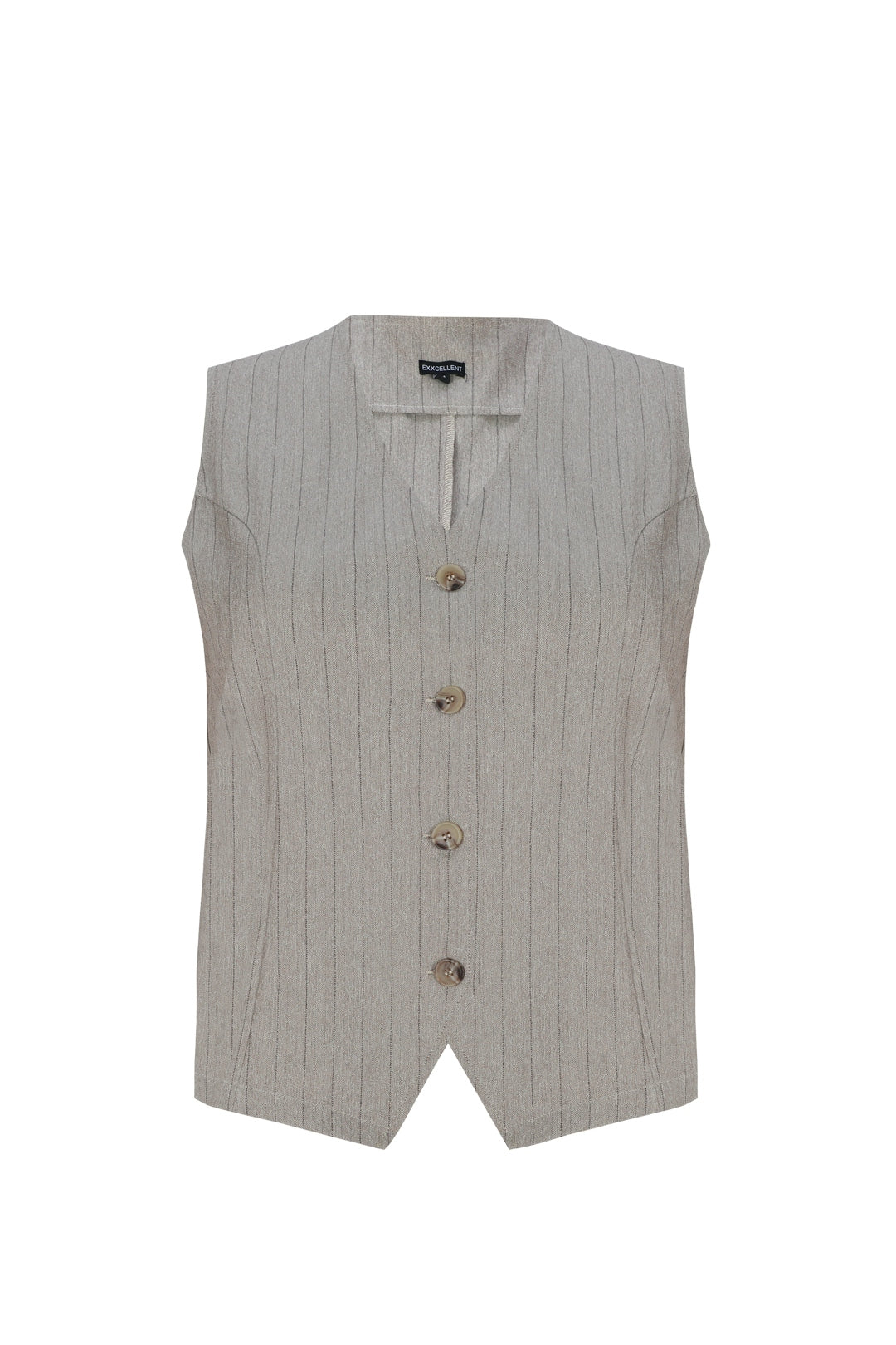 Dit mouwloze gilet van Exxcellent, model 26VQE21, is uitgevoerd in een licht bruine tint met een subtiel verticaal streepdessin. Het dames bodywarmer vestje heeft een klassieke V-hals en sluit aan de voorzijde met vier bijpassende knopen. Het kledingstuk is afgewerkt met een puntige zoom aan de onderkant. Dit gilet is volledig gevoerd en daarmee een nuchtere toevoeging aan je garderobe.
