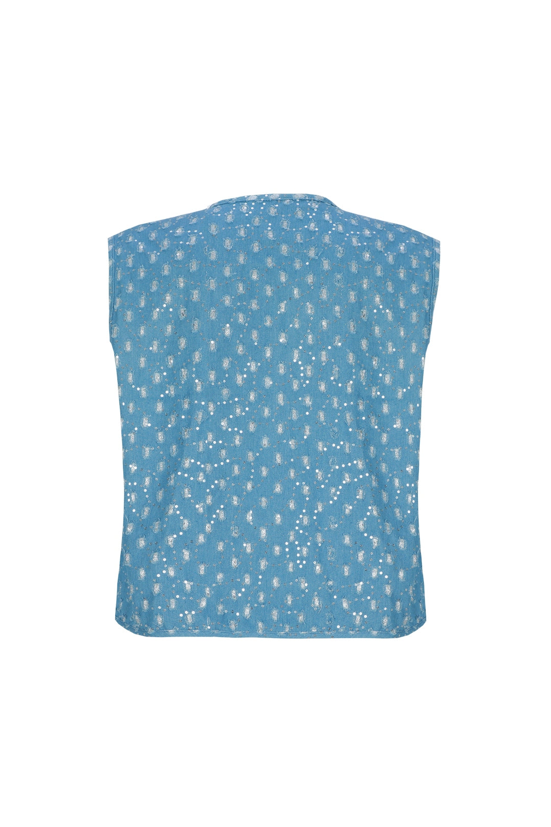Dit lichtblauwe gilet van Exxcellent heeft een ronde halslijn en een open model aan de voorzijde. Het mouwloze vestje is voorzien van een all-over dessin van zilverkleurige stippen en streepjes die zorgen voor een casual en moderne uitstraling. Dit Exxcellent bodywarmer model 26VZE29 is een gevoerd item dat je makkelijk over andere kleding draagt.