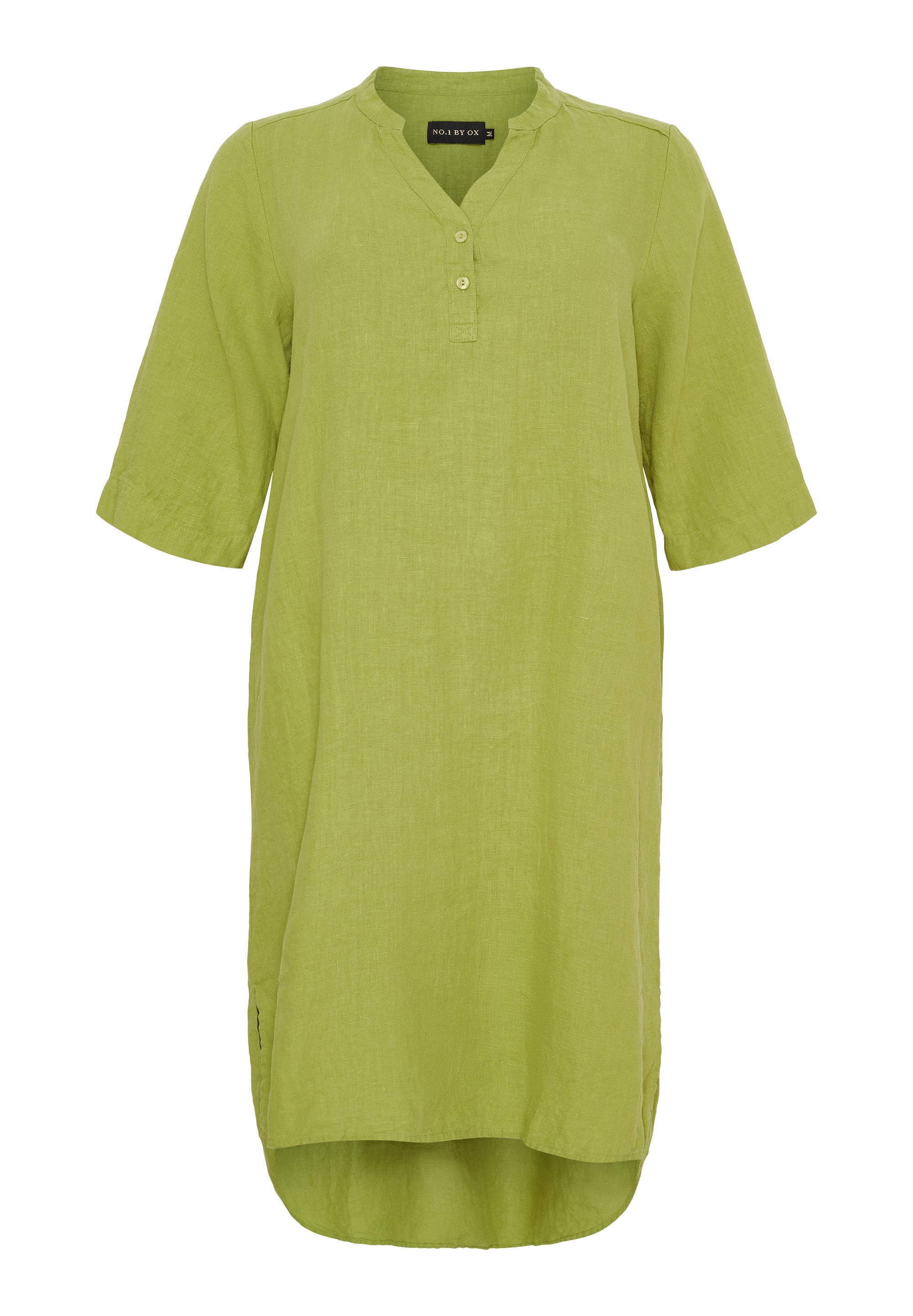De No.1 by Ox Jurk 61778 Groen is een tuniek model uitgevoerd in een linnenlook stof die licht en luchtig aanvoelt. Dit casual kledingstuk van het merk No.1 by Ox heeft een korte knoopsluiting met drie knopen aan de bovenzijde en een klassieke opstaande kraag. De driekwarthoes en de afgeronde zoom met zijsplitten geven deze zomerjurk een moderne uitstraling. Deze groene jurk is comfortabel en makkelijk te dragen.Pasvorm en Stijladvies