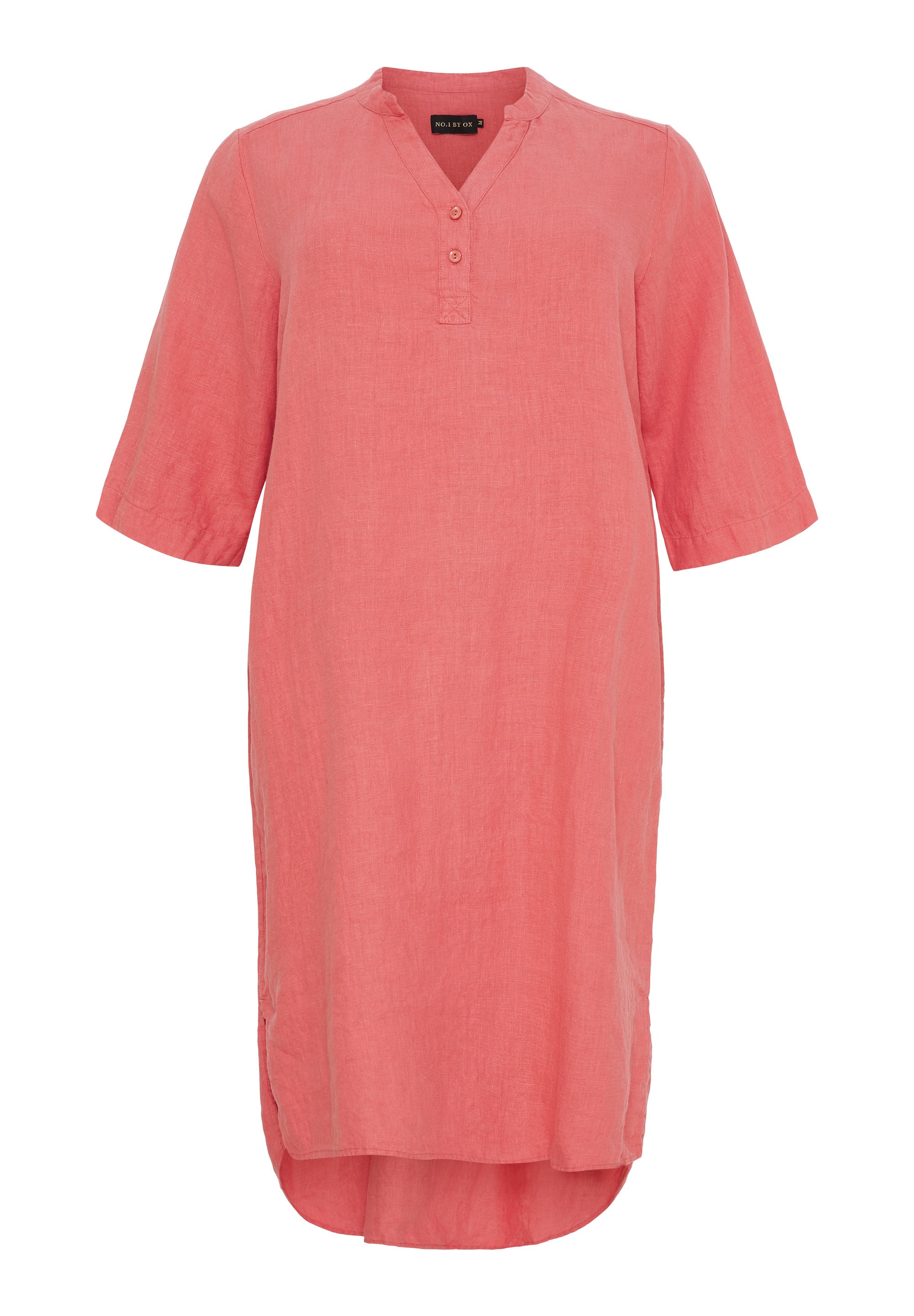 Deze middellange No.1 by Ox Jurk 61778 Rood in linnenlook heeft een rechte pasvorm en driekwart mouwen. De linnen jurk is uitgevoerd met een kleine opstaande kraag en een korte knoopsluiting met drie knopen aan de voorzijde. De casual jurk, ontworpen door het merk No.1 by Ox, heeft aan de onderzijde afgeronde zijsplitten die zijn voorzien van decoratieve knoopjes. Deze kleding zit comfortabel en voelt licht aan.
