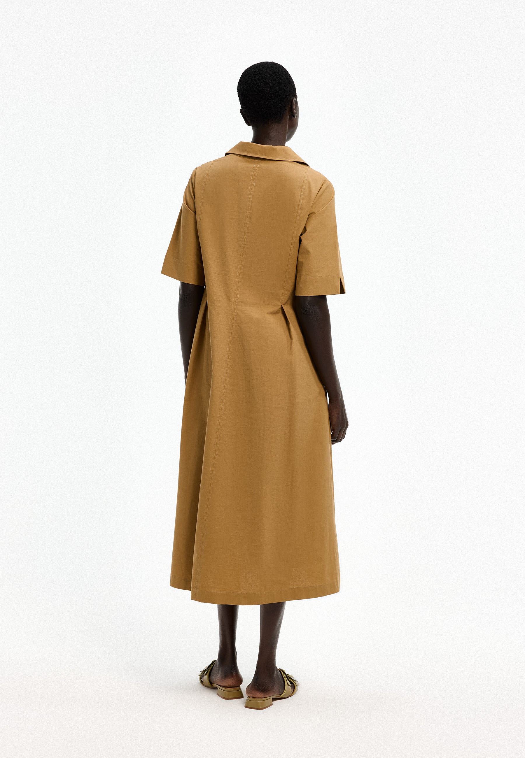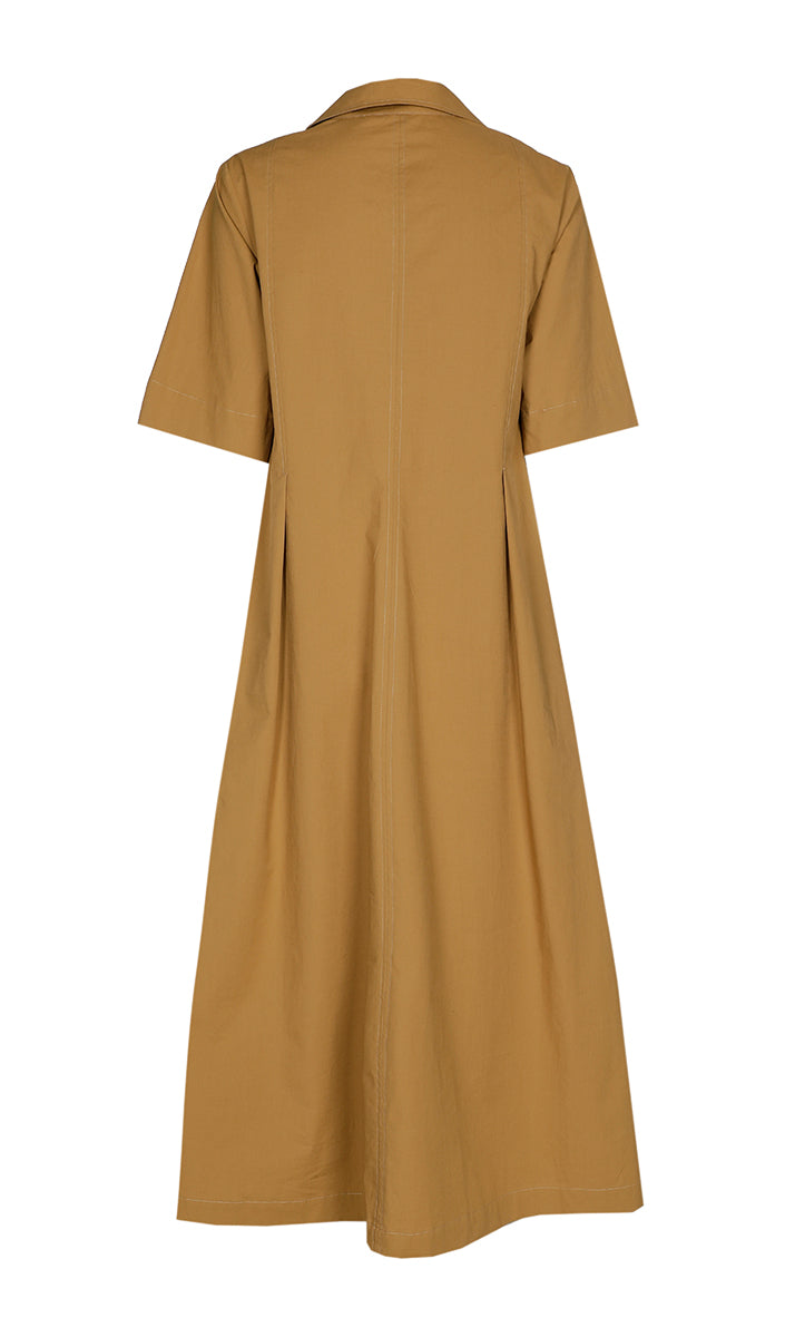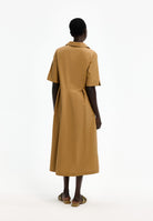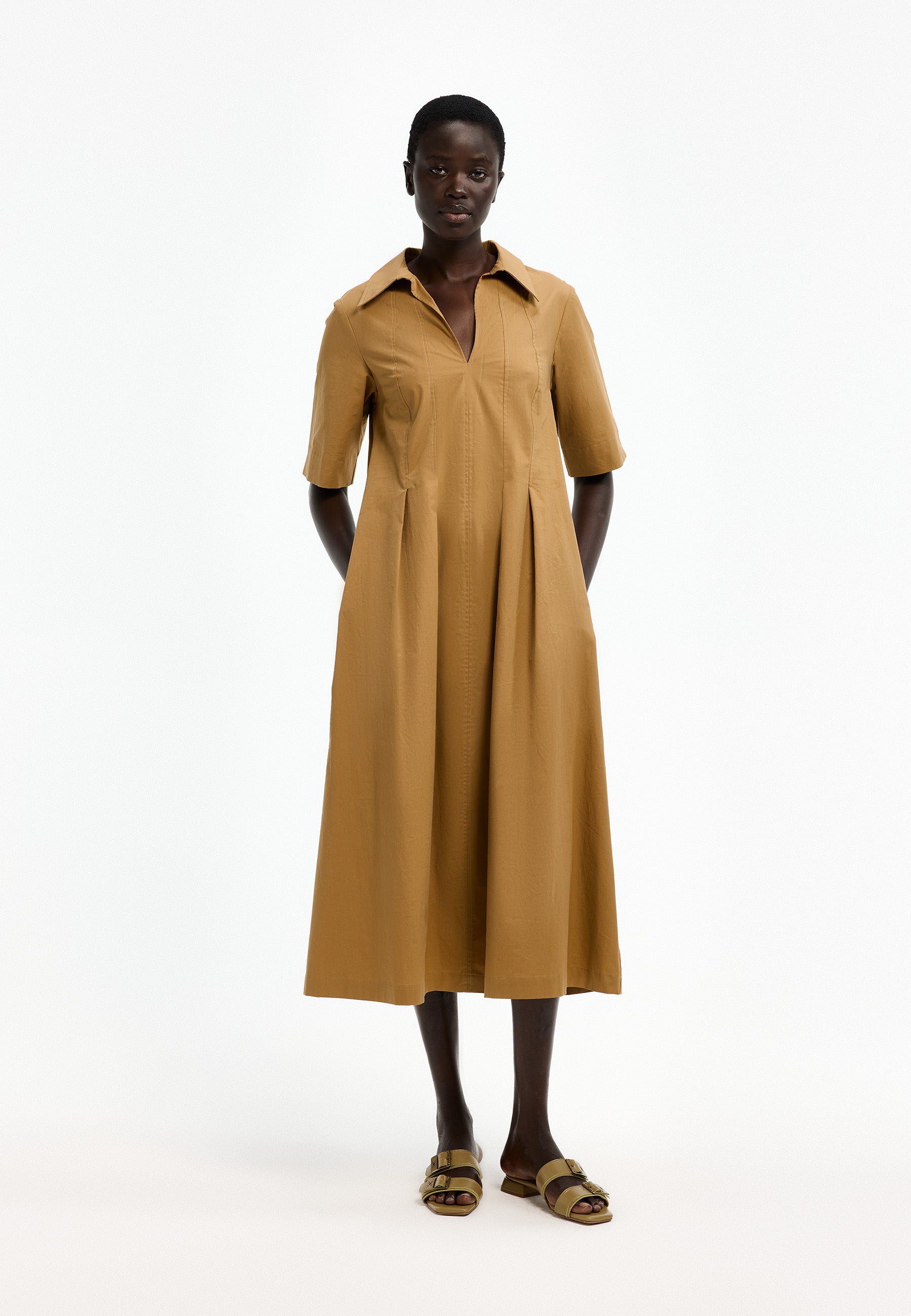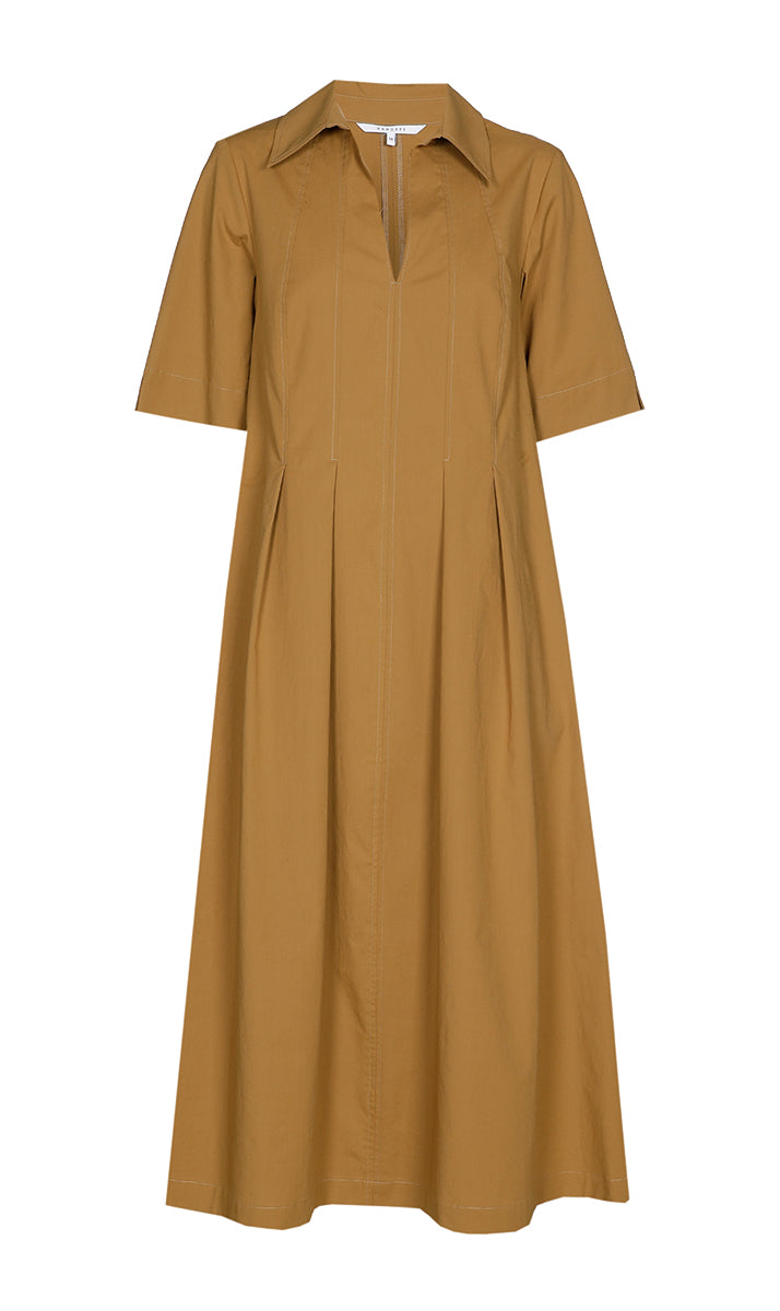 Deze lange jurk van Xandres is uitgevoerd in de kleur bronze green. Het kledingstuk heeft een klassieke kraag en een V-hals. Aan de voorzijde en achterzijde bevinden zich verticale doorgestikte naden en ingezette plooien die voor een uitlopende vorm zorgen. De korte mouwen hebben een rechte zoom. Dit effen model valt tot op de kuit en heeft een toegankelijke uitstraling.