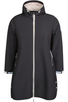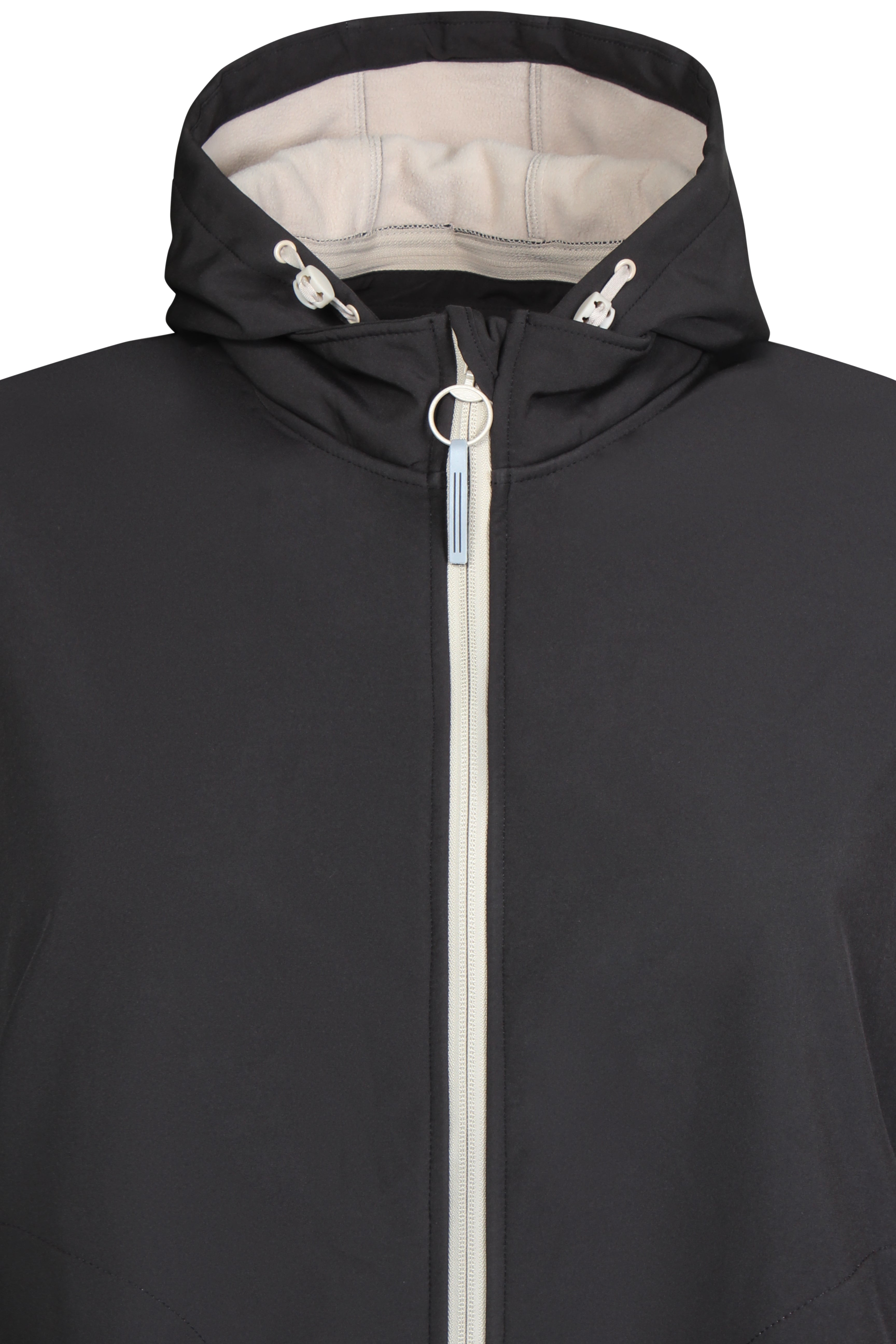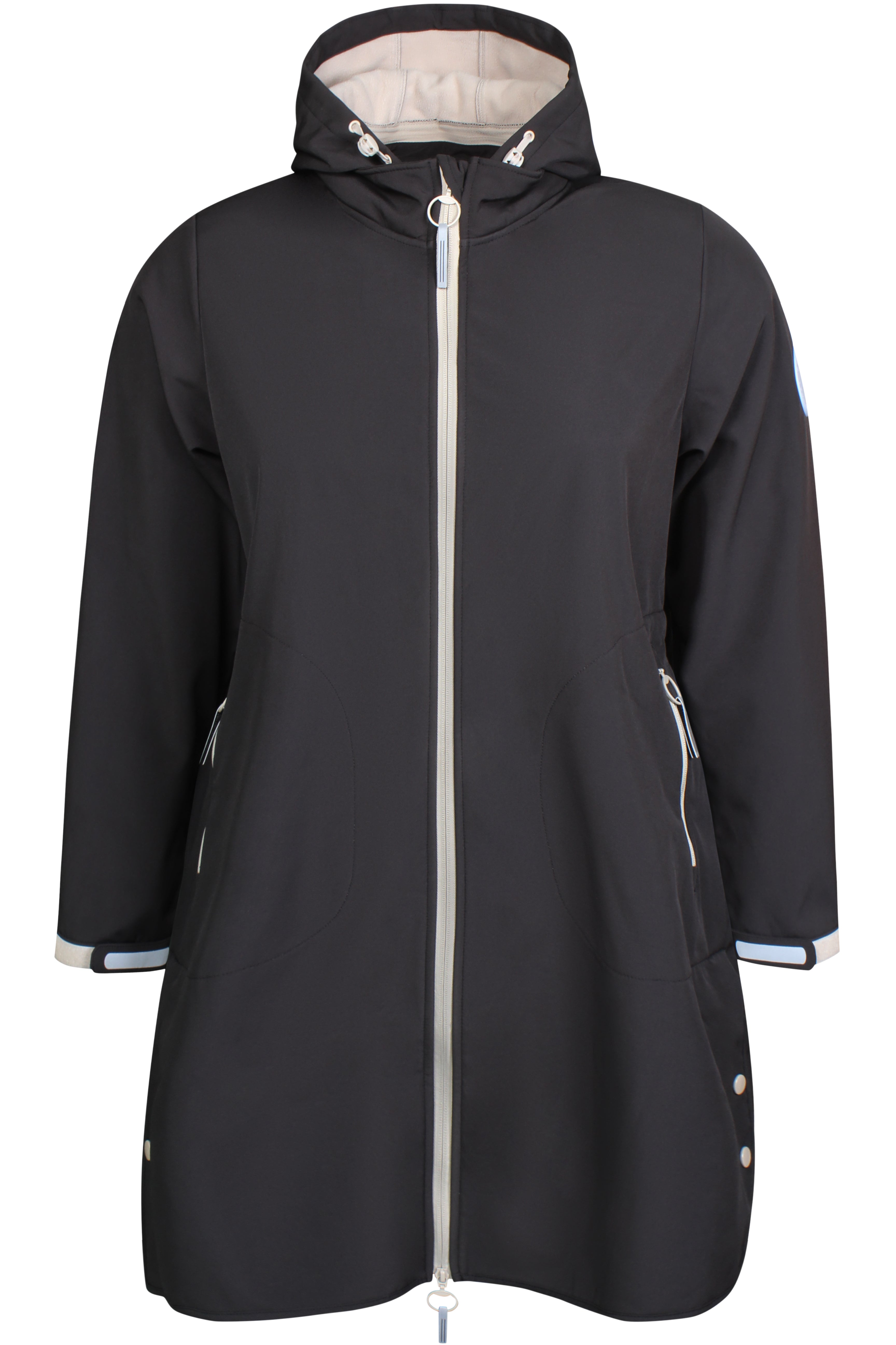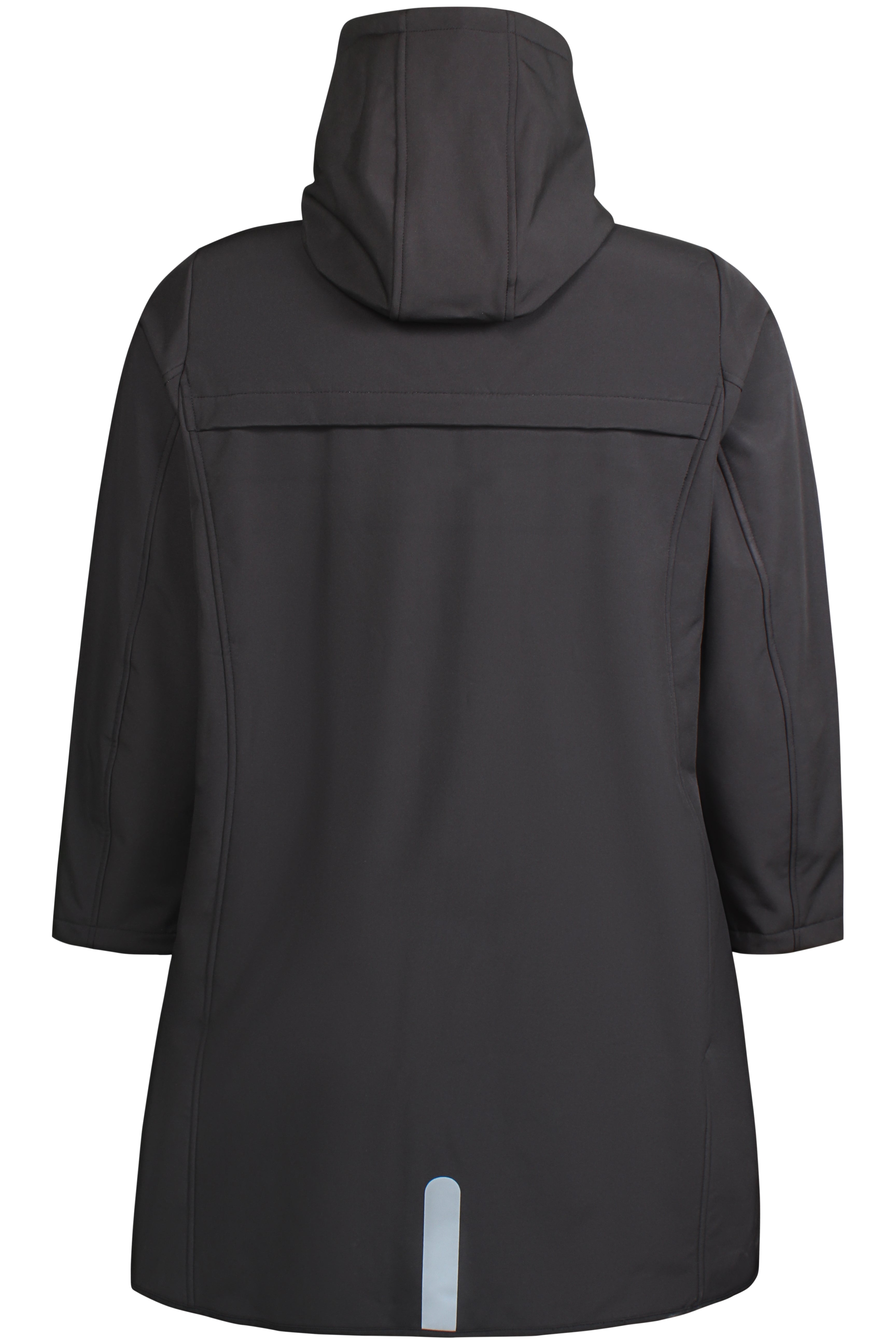 Dit Zhenzi zwarte softshell jack is ontworpen als een verlengde buitenjas voor een casual en moderne levensstijl. Het softshell jack, geschikt voor grote maten, sluit over de gehele lengte met een contrasterende ritssluiting. De Softshell jas is voorzien van een capuchon met witte trekkoorden en heeft vier zakken aan de voorzijde, waarvan twee met rits. De driekwart mouwen zijn afgewerkt met een lichte bies en knoopdetails aan de zoom. Achterop de jas bevindt zich bij de zoom een reflecterend element.