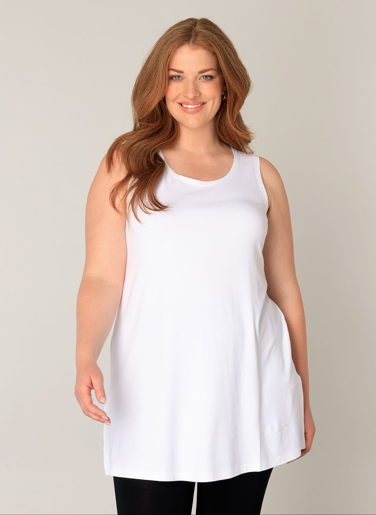 Deze witte mouwloze top van Base level curvy is ontworpen als essentieel basis kledingstuk voor de dagelijkse outfit. De basic tanktop heeft een ronde halslijn en een effen dessin. Het Base level curvy model valt langer en is wijder bij de heupen. Door het A-lijn silhouet heeft deze basistop een losse en casual pasvorm. De lengte van deze mouwloze top reikt tot over de heupen.