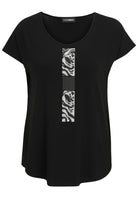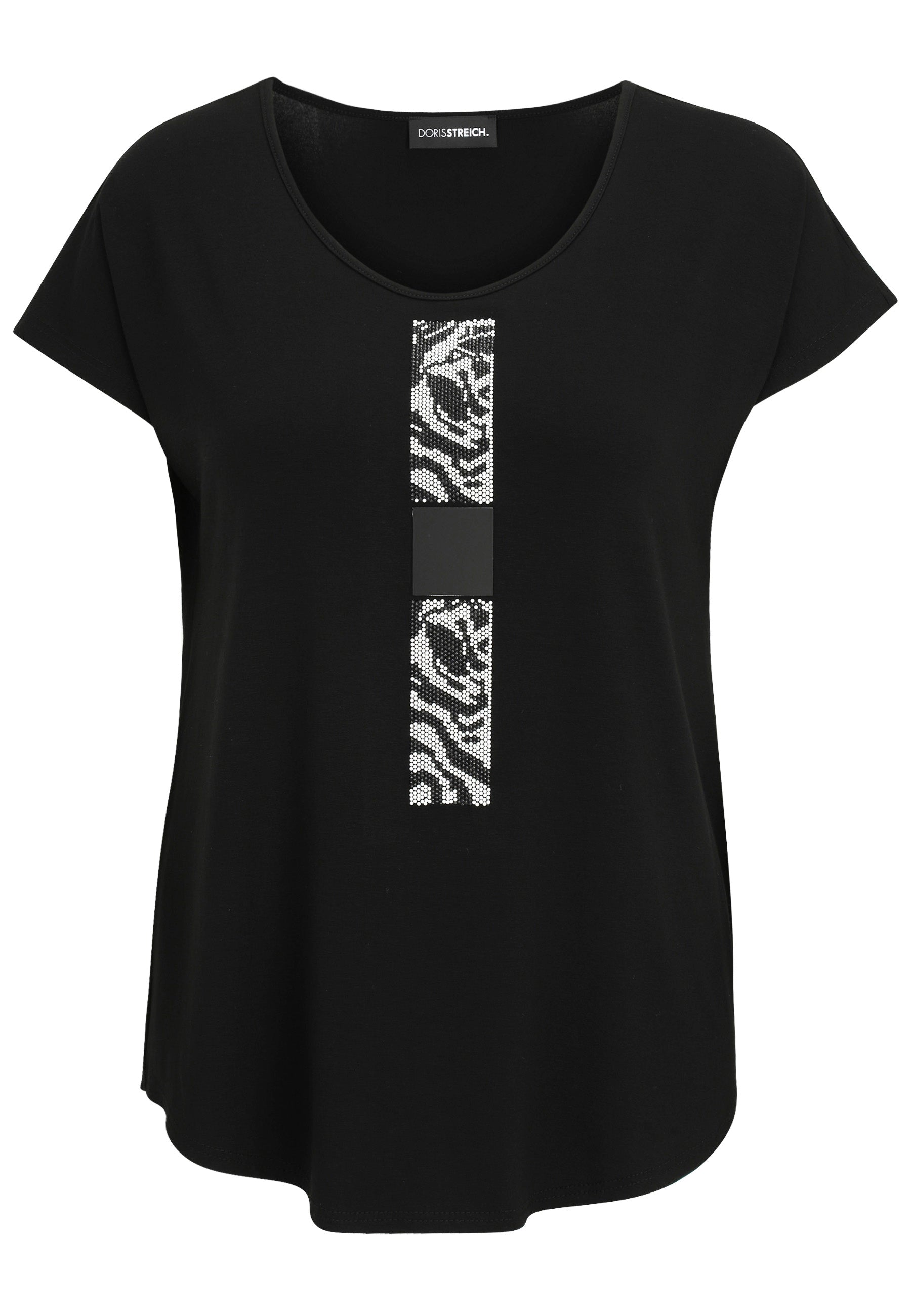 Dit zwarte T-shirt is van het merk Doris Streich en heeft een klassieke ronde hals en korte mouwen. Dit moderne bovenstuk valt casual en heeft een afgeronde zoom. Op de voorzijde is een verticale decoratieve baan aangebracht. Deze baan toont een zebra-achtig dessin van kraaltjes of beading, onderbroken door een effen zwarte rechthoek in het midden. Dit zwarte T-shirt is een fijne basis voor je dagelijkse kledingkeuze.