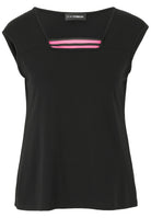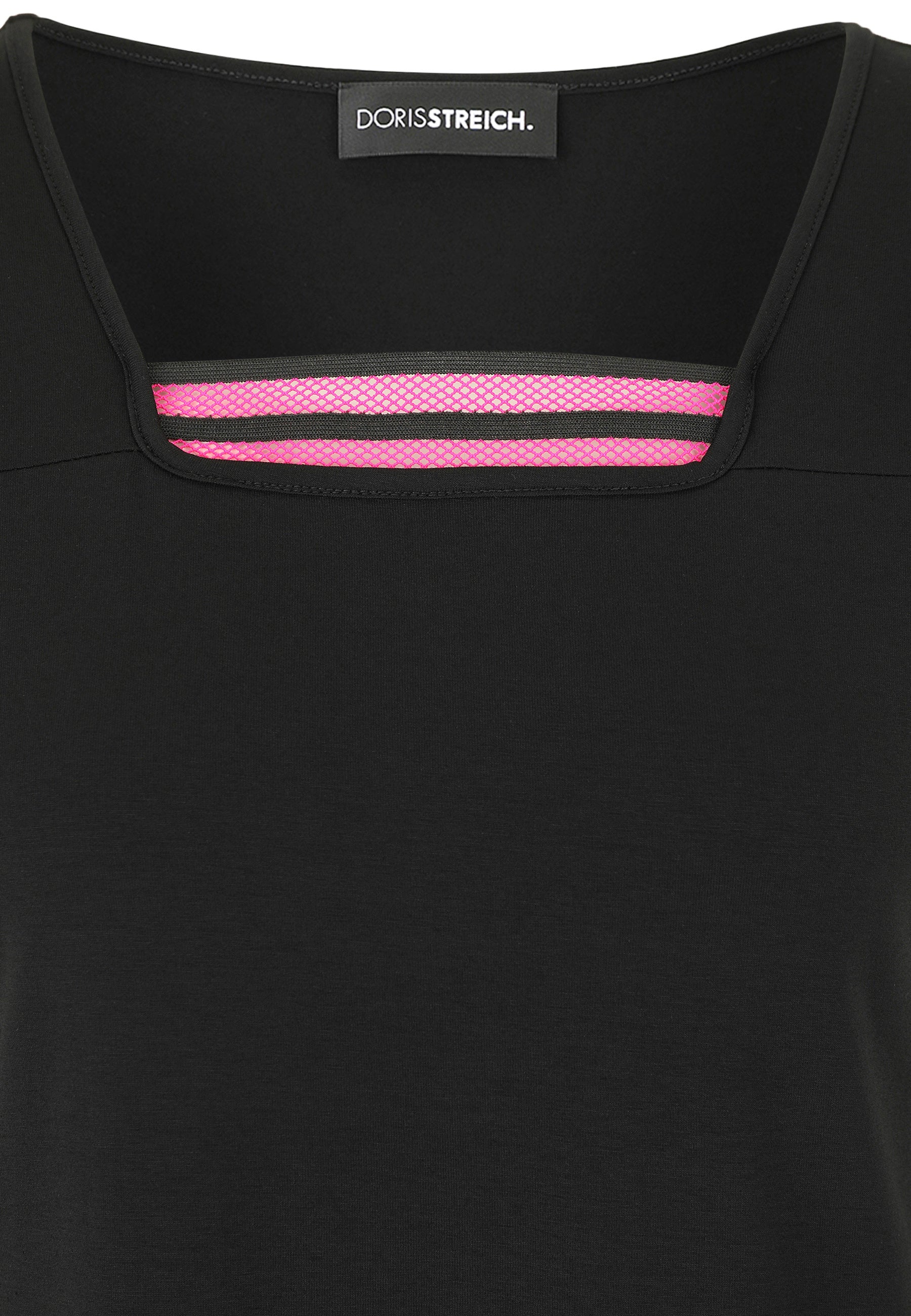 Deze Zwarte Top van Doris Streich heeft korte mouwen en een vierkante halslijn. De dames top is uitgevoerd in een egale zwarte stof. Een opvallend detail is de horizontale strook onder de hals, bestaande uit een mesh-inzet in felroze, geaccentueerd door twee dunne zwarte banden. Dit moderne shirt heeft een aangesloten pasvorm en een rechte zoom, wat zorgt voor een casual uitstraling.Pasvorm en Stijladvies