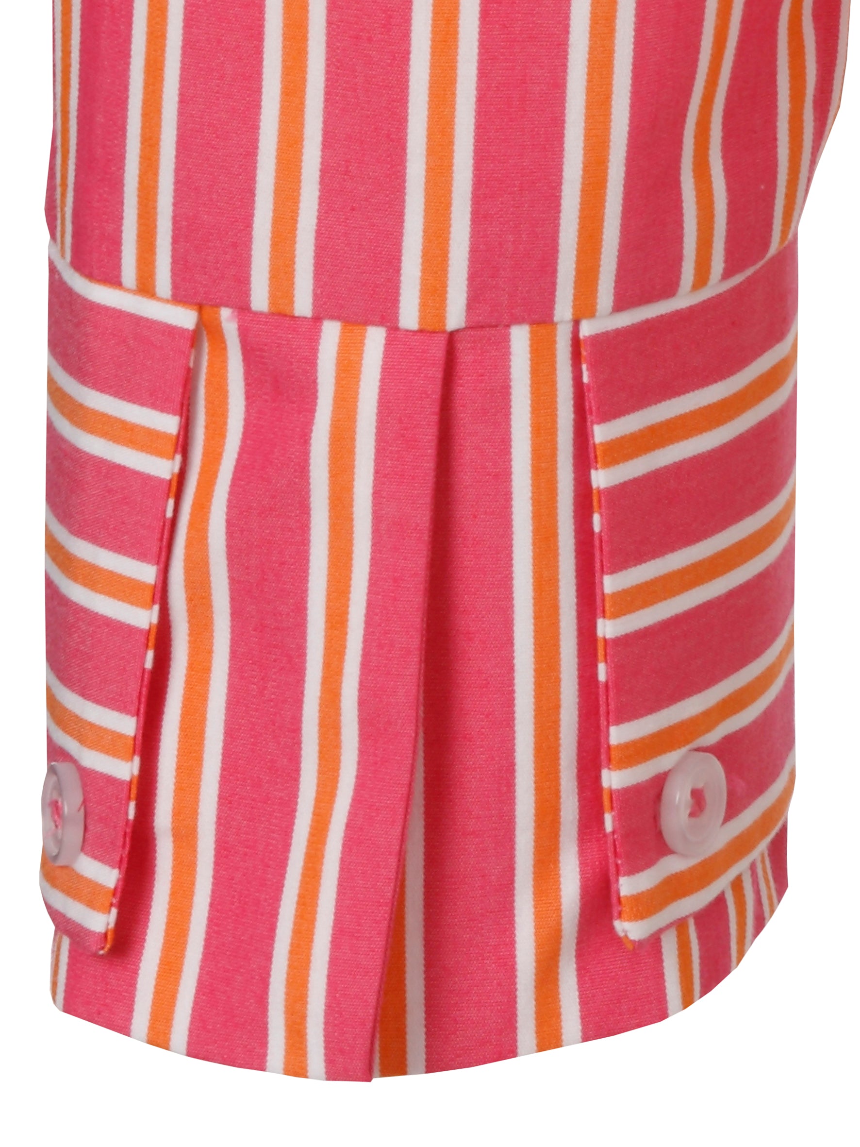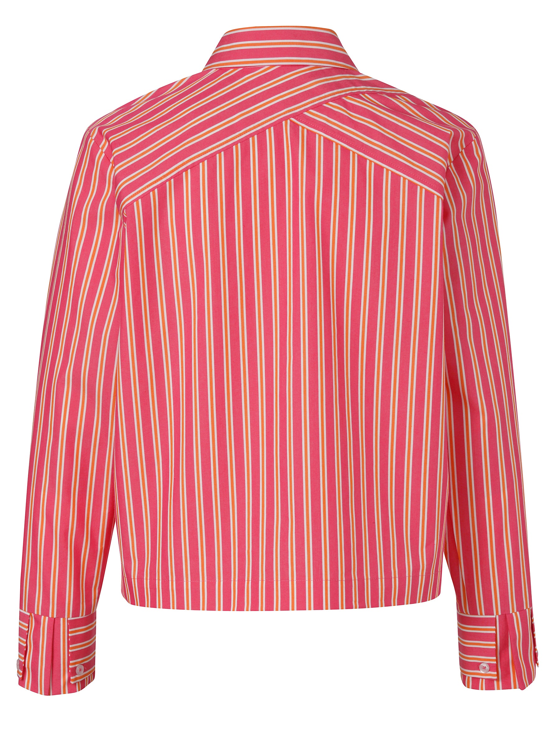 De Eiszeit 2671911 overhemdblouse is uitgevoerd in fuchsia met een verticaal streepdessin in wit en oranje. Deze korte damesblouse heeft een klassieke kraag en een sluiting met vijf knopen. Links op de borst zit één opgestikte zak met een witte franjerand. De lange mouwen zijn afgewerkt met brede manchetten voorzien van een dubbele knoopsluiting. Dit bovenstuk is gemaakt van een geweven katoenmix.