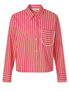 Deze moderne gestreepte blouse van Eiszeit heeft een rechte boxy pasvorm en valt kort op de taille. Je combineert deze fuchsia multicolor overhemdblouse gemakkelijk met een high waist broek of een effen gekleurde rok. Wil je meer zien van dit merk? Ontdek de volledige Eiszeit collectie.