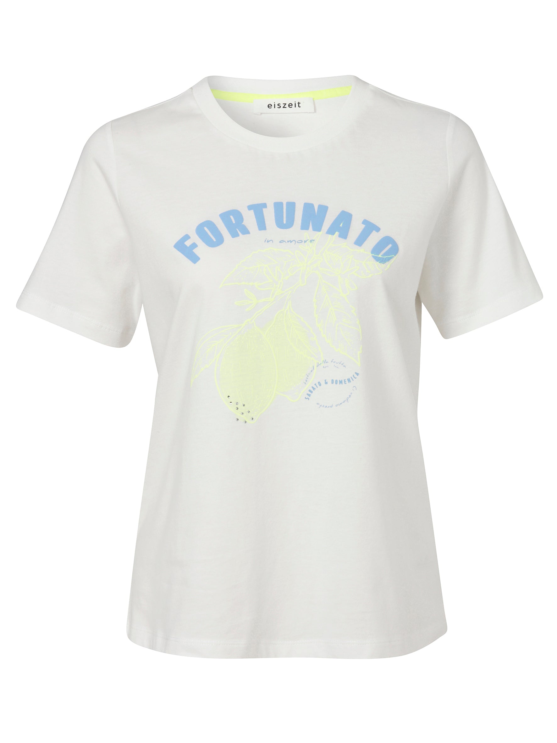 Dit casual offwhite T-shirt van Eiszeit heeft een rechte pasvorm en is afgewerkt met korte mouwen en een ronde hals. Het katoenen shirt, onderdeel van de 2671414-serie, heeft op de voorzijde een opvallende multicolor print. De opdruk bestaat uit een gestileerd citrusmotief in neongeel en lichtgroen, gecombineerd met de tekst ‘FORTUNATO’ in lichtblauw en het kleinere opschrift ‘in amore’. Dit bovenstuk is ideaal voor een relaxte look.Pasvorm en Stijladvies