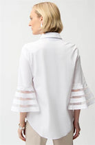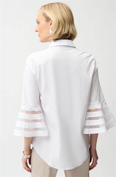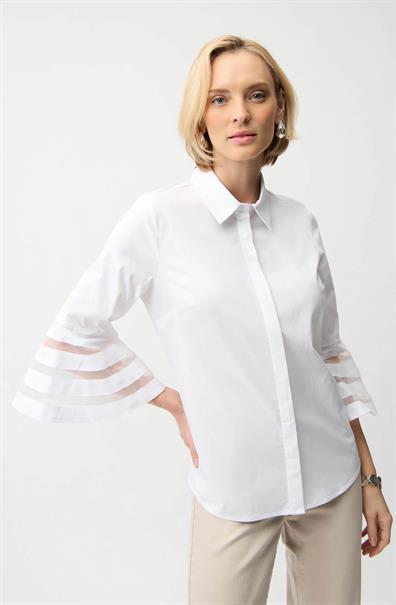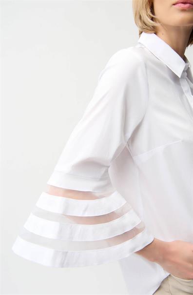 Dit Jospeh Ribkoff damesoverhemd in wit heeft een klassieke overhemdkraag en een nette knoopsluiting. De blouse valt soepel en is afgewerkt met een afgeronde zoom. De mouwen hebben een driekwart lengte en eindigen in een klokvorm. Dit ontwerpdetail wordt geaccentueerd door horizontale transparante inzetstukken. Deze witte top is een moderne interpretatie van een tijdloze klassieker.