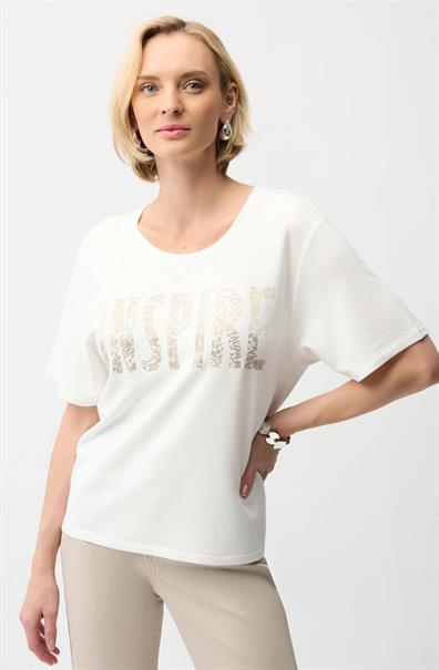 Dit witte korte mouwen shirt van Jospeh Ribkoff heeft een ruime, rechte pasvorm en een klassieke ronde hals. Centraal op dit bovenstuk is de tekstprint 'INSPIRE' geplaatst. De opdruk is uitgevoerd in een goudkleurige tint en is voorzien van een dessin dat bestaat uit een combinatie van subtiele dierenprints en kleine glanzende steentjes. Dit casual T-shirt is ontworpen voor een licht en comfortabel gevoel, ideaal voor een relaxte uitstraling.