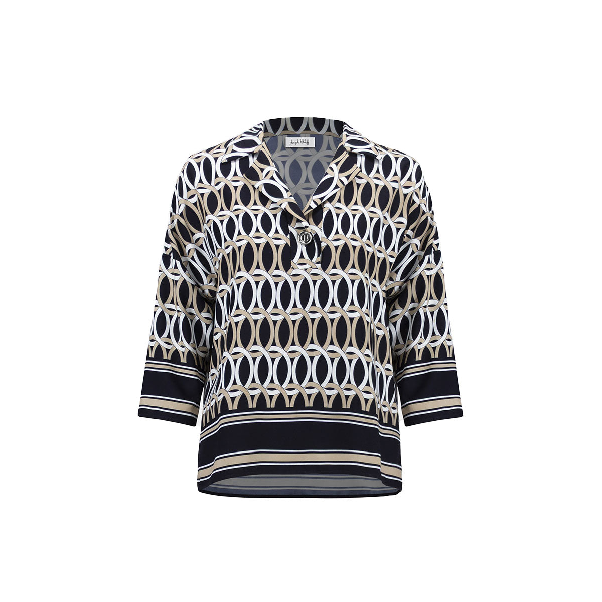 De Joseph Ribkoff top kenmerkt zich door een levendige, geometrische print in marineblauw, wit en beige tinten. Deze casual blouse heeft een kraag en een open V-hals. De snit is ruimvallend met driekwart mouwen. Aan de voorzijde bevindt zich een decoratieve knoopsluiting onder de halslijn. De boorden en de zoom zijn voorzien van contrasterende horizontale strepen. Dit Joseph Ribkoff kledingstuk heeft een moderne uitstraling die bijdraagt aan een optimistische look.Pasvorm en Stijladvies
