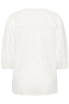 Deze casual witte blouse van het merk Kaffe curve, onderdeel van DK Company, is een toegankelijke top voor je dagelijkse look. Het item met productnummer 2007 10583953 Chalk heeft een V-hals en een doorlopende knoopsluiting. De blouse heeft driekwart mouwen met lichte puff-details bij de schouders, wat zorgt voor een moderne pasvorm. Het geweven dessin met subtiele diagonale lijnen maakt deze damesblouse compleet.Pasvorm en Stijladvies