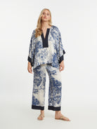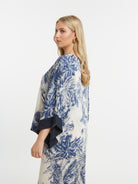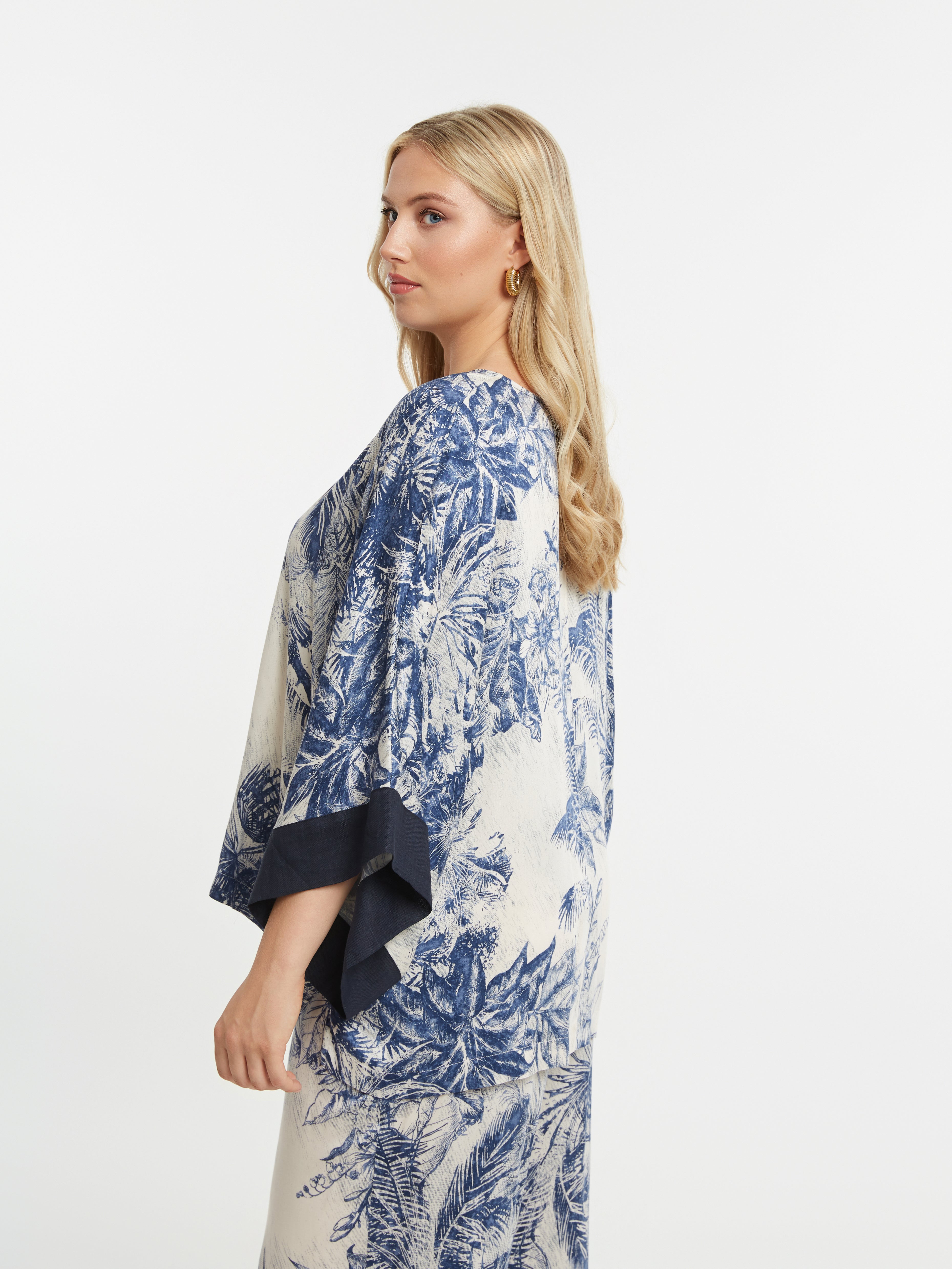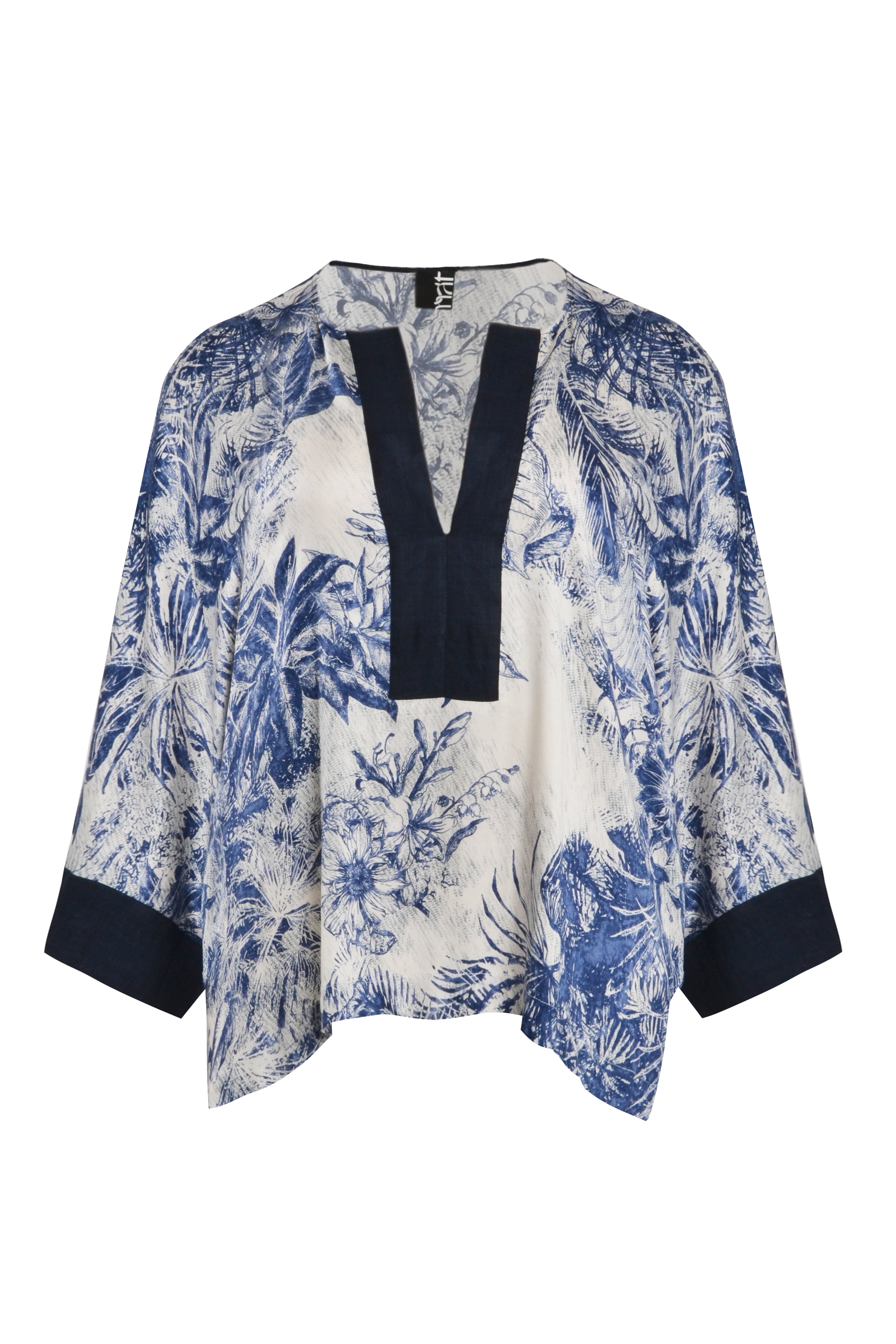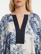 Deze wijde top van MAT is uitgevoerd in een kaftan-stijl. Het losvallende bovenstuk heeft een tropisch dessin met palmbladeren en bloemen in donkerblauw en crème. De tuniek is voorzien van een diepe V-hals, afgewerkt met een effen donkerblauwe bies. De korte, wijde mouwen zijn eveneens afgezet met een donkerblauwe rand. Dit model valt tot over de heupen en biedt een comfortabele, luchtige pasvorm.
