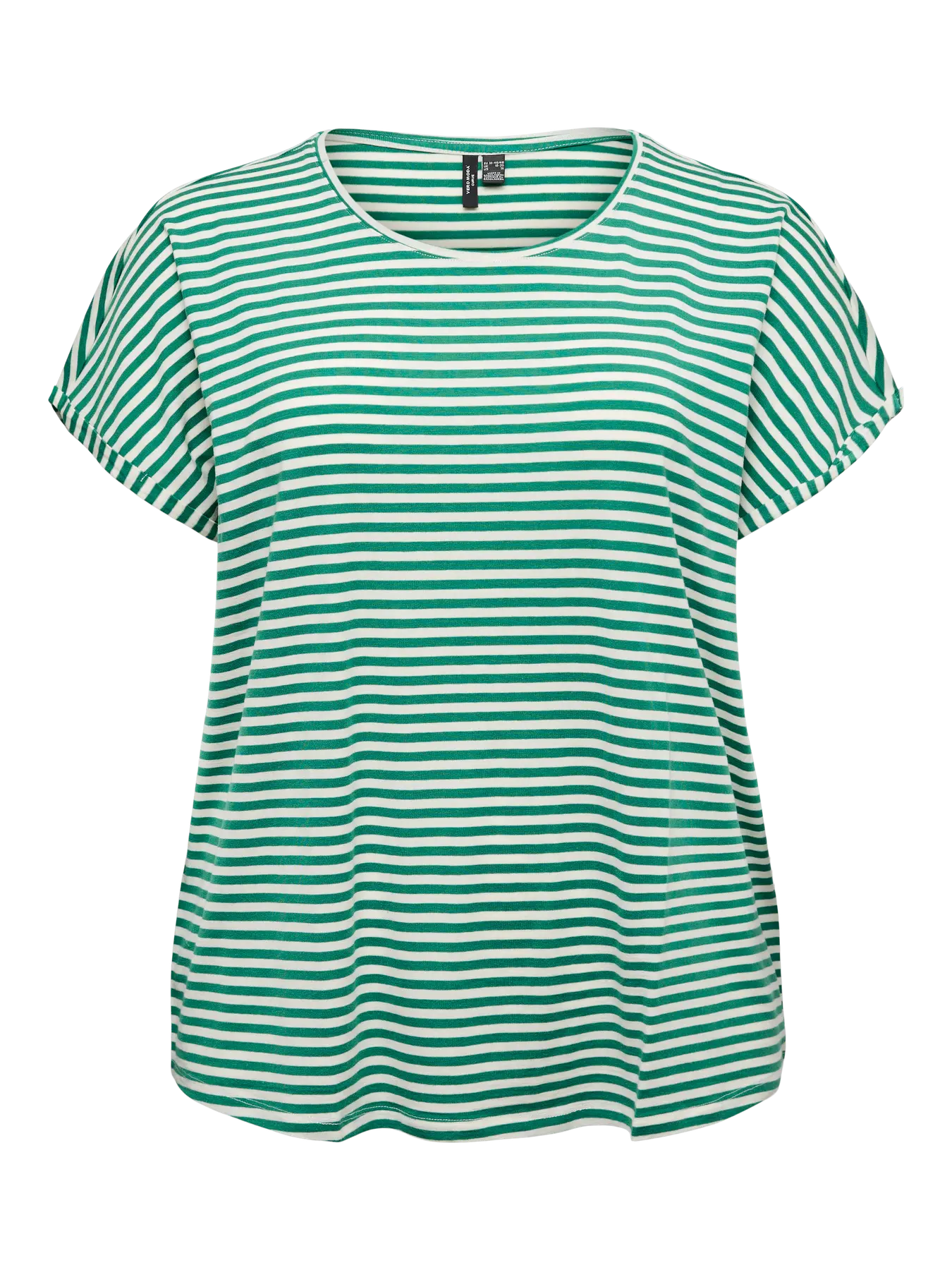 Dit gestreepte T-shirt van Vero Moda Curve heeft een casual ontwerp met korte, omgeslagen mouwen. Het dames T-shirt kenmerkt zich door het horizontale streepdessin in de kleuren Bosphorus (groen) en Birch (crèmewit). Het shirt heeft een ronde hals, afgewerkt met een effen bies. Dit gestreepte shirt is onderdeel van de plus size collectie van Vero Moda Curve en biedt een ruime pasvorm.