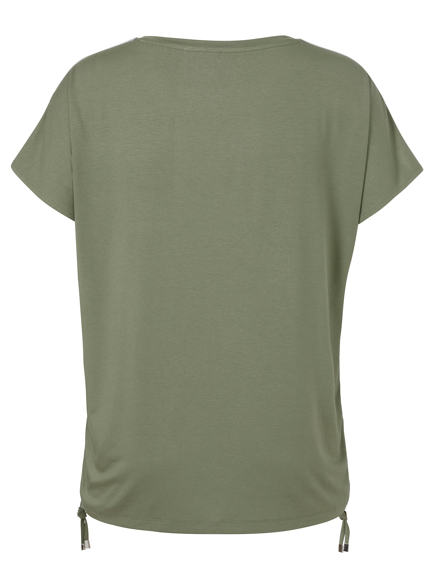 Deze casual Via Appia Due dames top heeft een moderne multicolor print in salbei, wit en blauwtinten. Het shirt met korte mouwen en ronde hals is afgewerkt met een duidelijke tekstprint "ENJOY LIVE INSPIRE" op de voorzijde. De print wordt geaccentueerd door kleine strass steentjes. De onderzijde van deze Via Appia Due blouse is voorzien van verstelbare trekkoorden aan beide zijden. Dit korte mouwen shirt heeft een effen achterpand in salbei kleur.