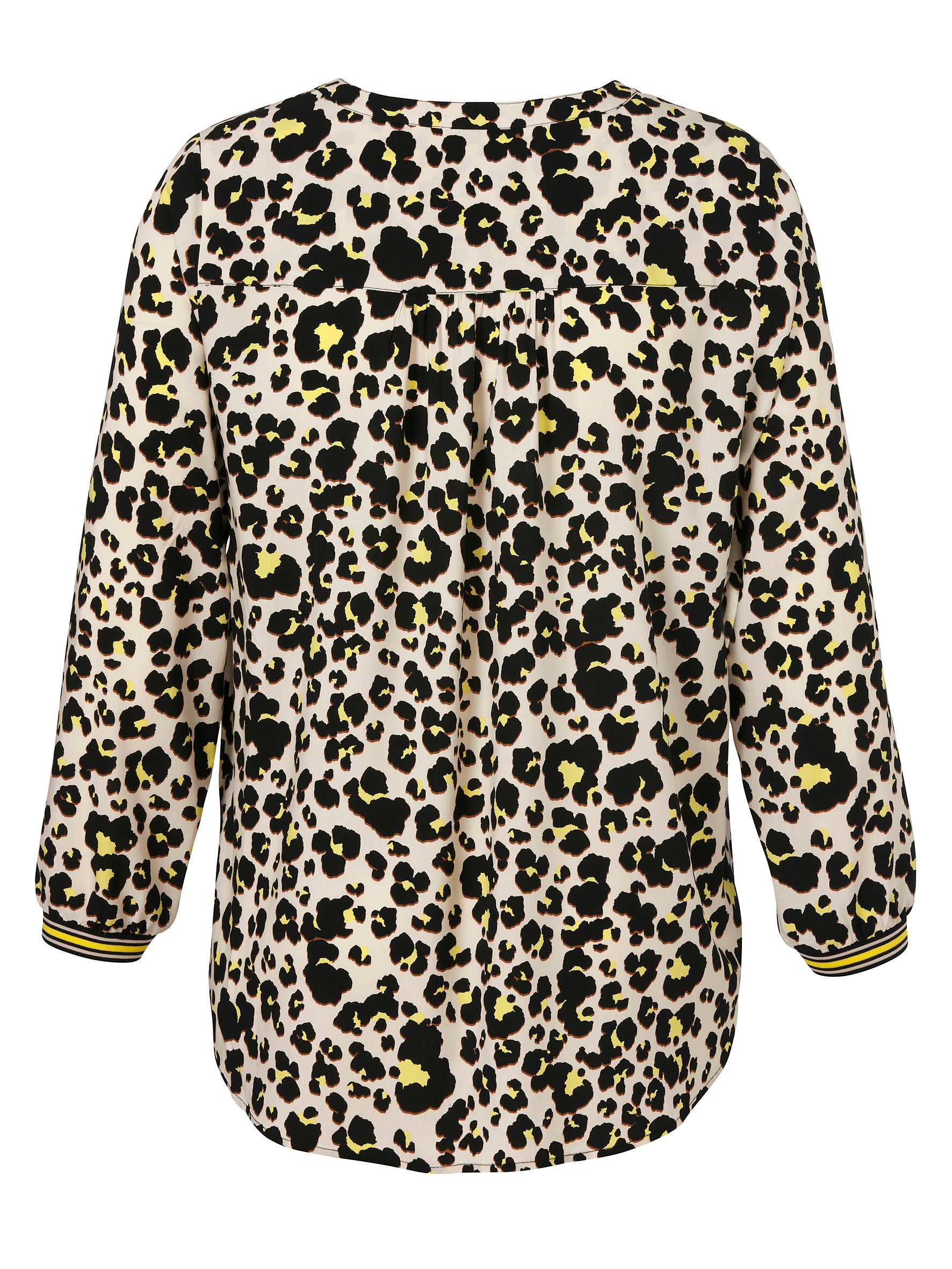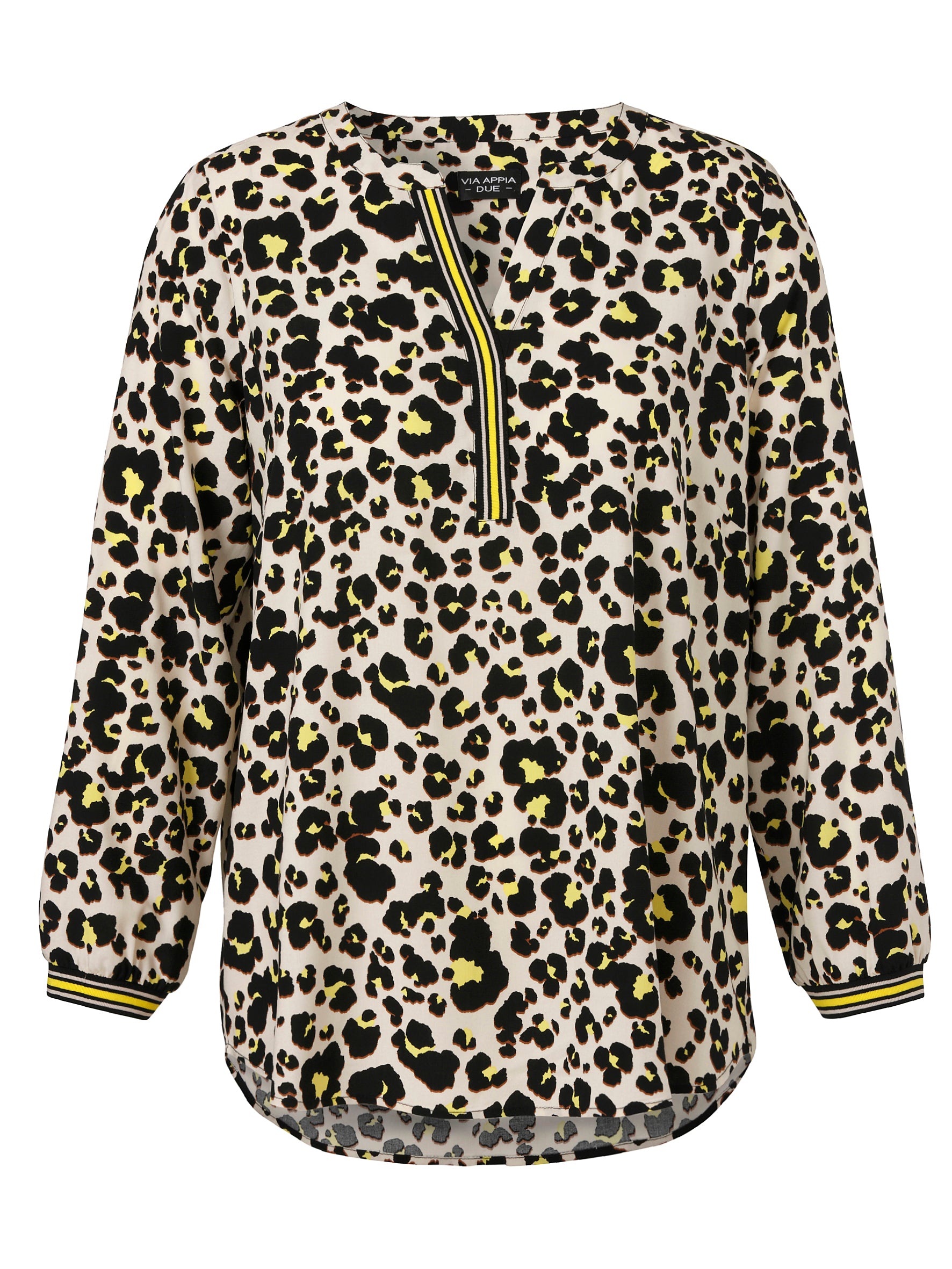 Deze Via Appia Due Blouse heeft een casual en toegankelijke uitstraling dankzij de all-over animal print in zwart, crème en felgeel. De hals is uitgevoerd met een ronde V-hals en een korte rits, afgewerkt met een gestreepte band. Dit dames shirt met driekwart mouwen en elastische, gestreepte manchetten zorgt voor een luchtig draagcomfort. De rug is voorzien van een enkele plooi vanuit de nek voor een soepele val.