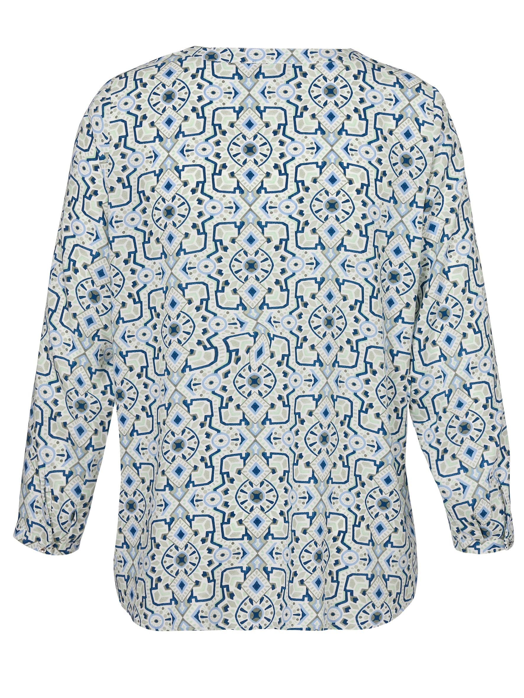 De damesblouse van Via Appia Due kenmerkt zich door een modern, all-over geometrisch patroon in salbei multicolor. De print combineert heldere tinten wit en saliegroen met diverse blauwtinten. De halslijn is uitgevoerd als een V-hals met een korte, decoratieve rits in het salie. Dit bovenstuk is voorzien van lange mouwen die comfortabel vallen en heeft een afgeronde zoomlijn. Dit item is een casual toevoeging aan je garderobe.Pasvorm en Stijladvies