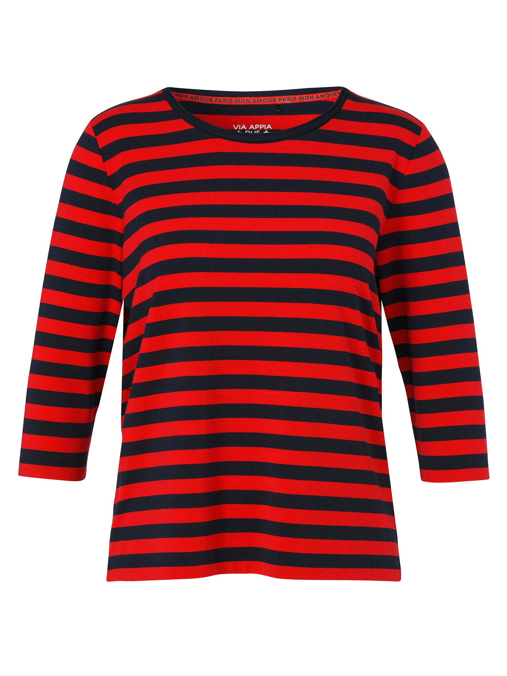 Dit Via Appia Due T-shirt combineert de kleuren marine en rot in een klassiek horizontaal gestreept dessin. Het bovenstuk is voorzien van driekwart mouwen en een ronde hals. De binnenkant van de halslijn heeft een decoratieve tekstprint met de woorden "MON AMOUR PARIS". Dit casual shirt is een comfortabel bovendeel dat je gemakkelijk combineert voor een optimistische look. Het model 2611407 van Via Appia Due is ontworpen om een brede maatvoering te ondersteunen.