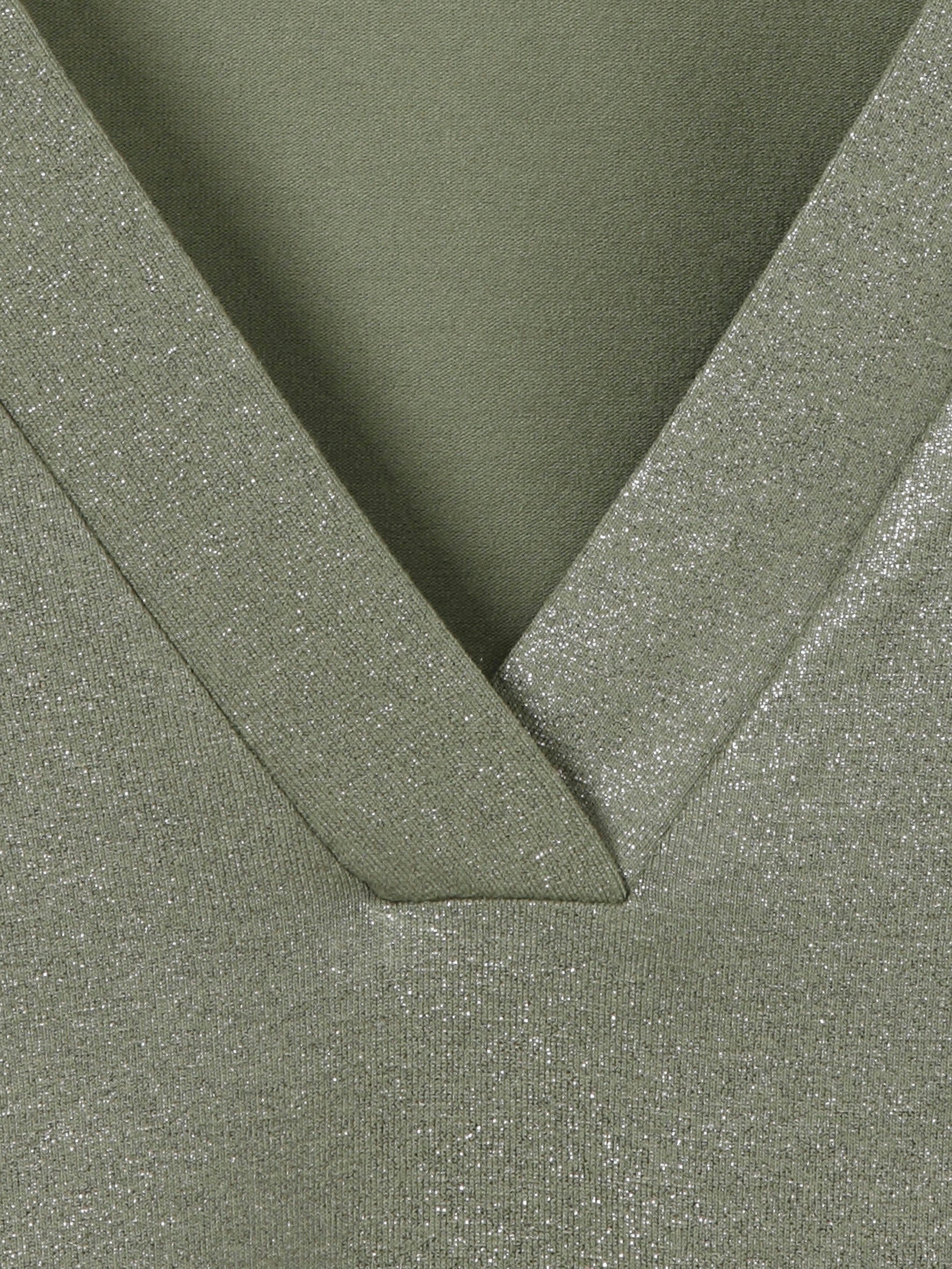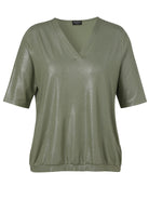 Dit korte mouwen T-shirt van het merk Via Appia Due is uitgevoerd in een salbei groene kleur. Het bovenstuk is voorzien van een V-hals en een opvallende metallic glansafwerking over de gehele stof, wat het shirt een moderne look geeft. De zoom van dit T-shirt heeft een subtiele elastische band die zorgt voor een licht ingesnoerde, comfortabele pasvorm onderaan. Door de effen kleur is dit een veelzijdig kledingstuk.