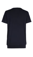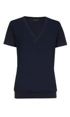 Dit donkerblauwe V-hals T-shirt van Xandres is een nuchtere basis voor je casual kledingcollectie. De top heeft korte mouwen en een diepe V-hals, afgewerkt met een subtiel kruissteek detail aan de voorzijde. Het Xandres shirt valt recht en is daardoor comfortabel om te dragen. De onderzijde van deze donkerblauwe top is afgewerkt met een brede, gestikte boord. Dit maakt de top een veelzijdig stuk dat je makkelijk combineert.