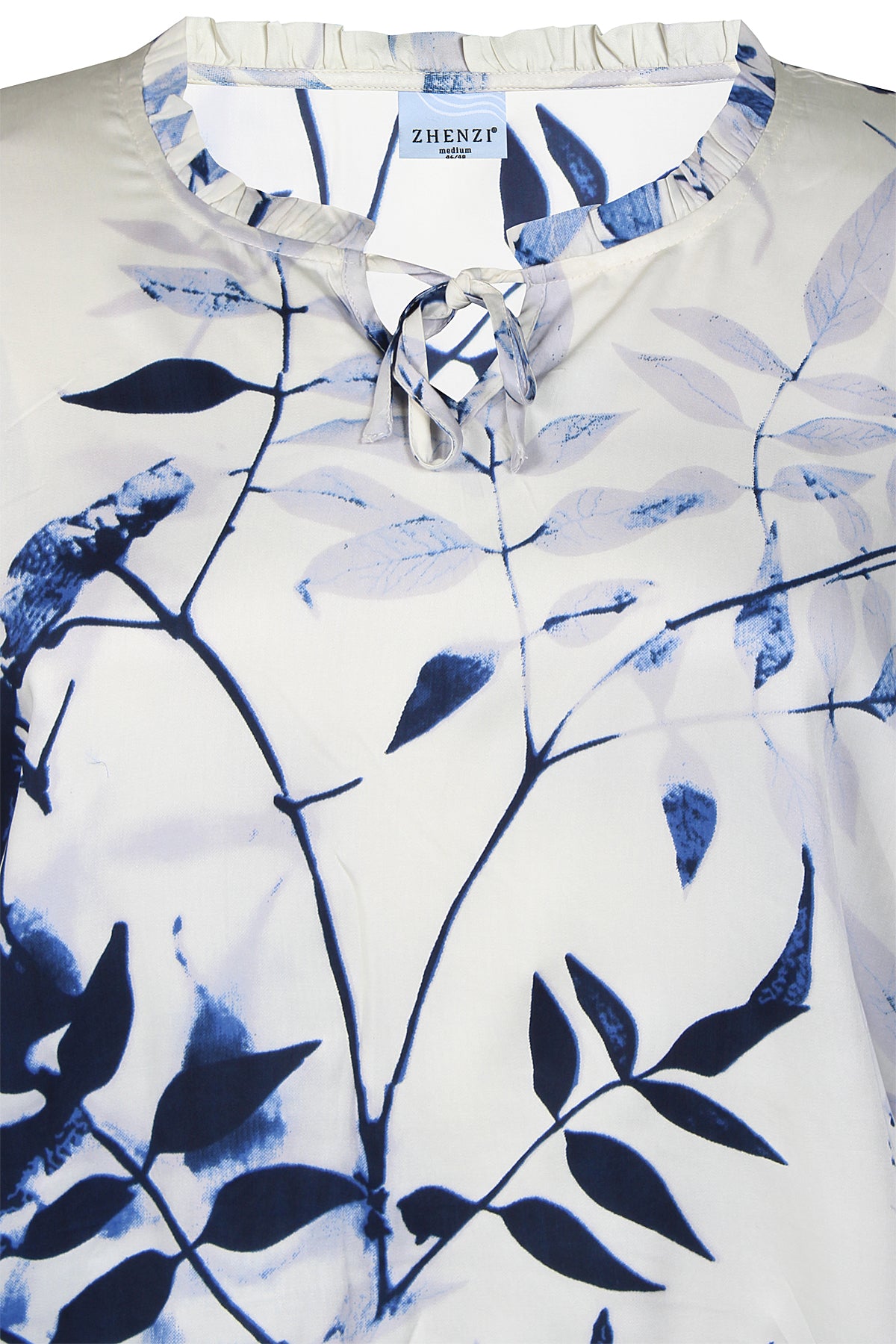 Deze Zhenzi Blouse 201331 Lichtblauw is uitgevoerd met een lange mouw en een all-over botanisch dessin in donkerblauw op een lichte achtergrond. De dames top is afgewerkt met een ronde halslijn die voorzien is van een subtiele ruche en een korte V-split met strikdetail. De elastische boorden bij de heup en polsen zorgen voor een casual, bloezend effect. Deze Zhenzi dameskleding is perfect voor je dagelijkse, ontspannen look.