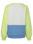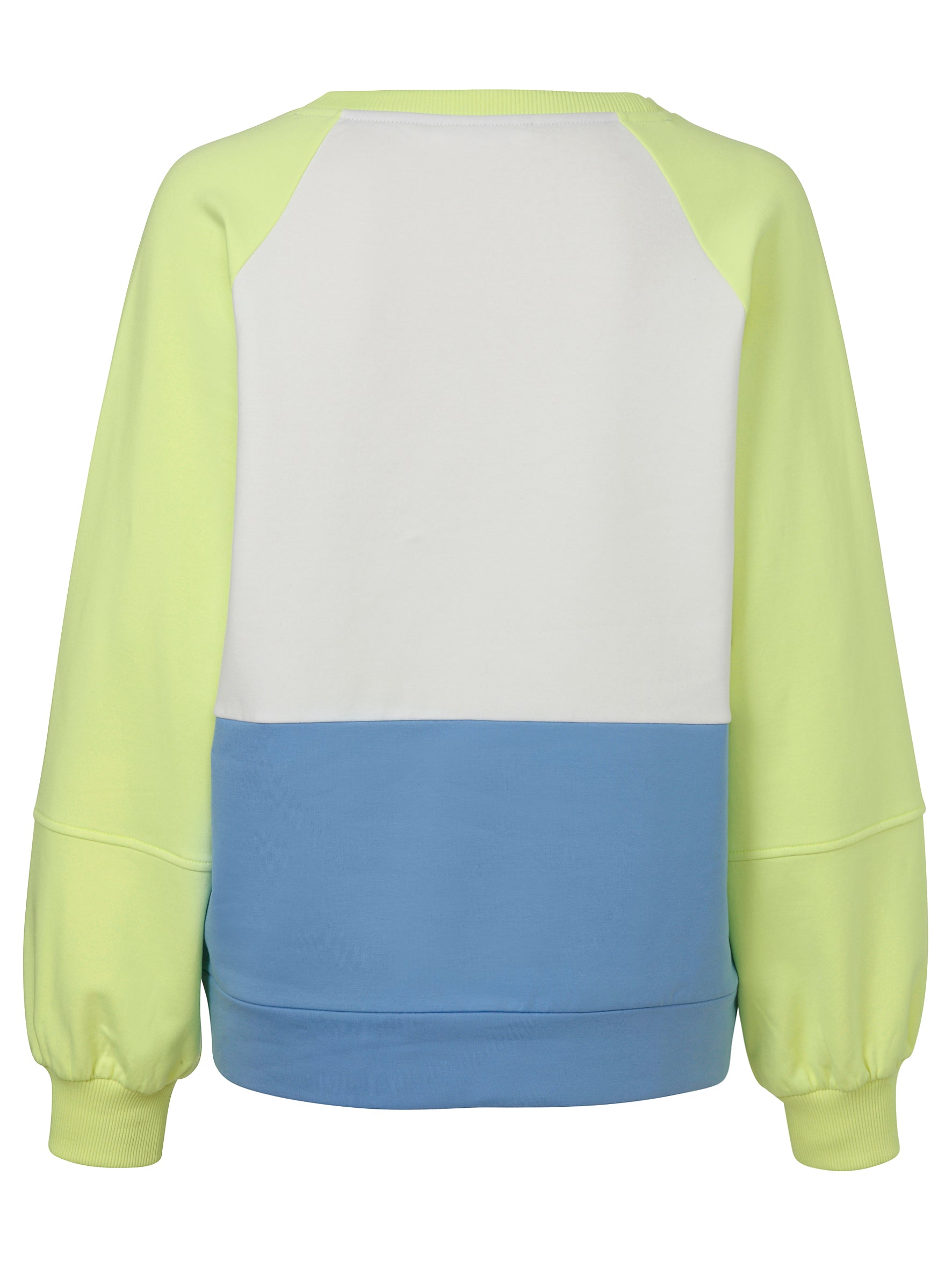 Deze sportieve Eiszeit trui in lime multicolor is uitgevoerd in een opvallend colour block dessin. De sweater heeft een ronde hals en raglanmouwen. Op het witte borstgedeelte vind je de donkerblauwe tekstprint "più AMORE per favore". Deze pullover, model 2671472, combineert de kleuren lime, wit en lichtblauw. De lange mouwen zijn afgewerkt met elastische boorden, wat zorgt voor een casual en comfortabele pasvorm. Je creëert hiermee direct een optimistische look.Pasvorm en Stijladvies
