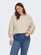 Deze Only Carmakoma trui in Oatmeal beige heeft een casual en toegankelijke uitstraling. Het is een comfortabele sweatshirt met lange mouwen en een ronde hals. De ruime pasvorm zorgt voor een ontspannen look die je makkelijk kunt dragen. Een opvallend kenmerk van deze sweater is de glanzende goudkleurige folieprint van bloemmotieven langs beide mouwen. De uiteinden van de mouwen en de onderkant zijn afgewerkt met een geribbelde boord, wat zorgt voor een gestructureerde afwerking. Dit maakt de trui een veelzijdig item voor je garderobe.