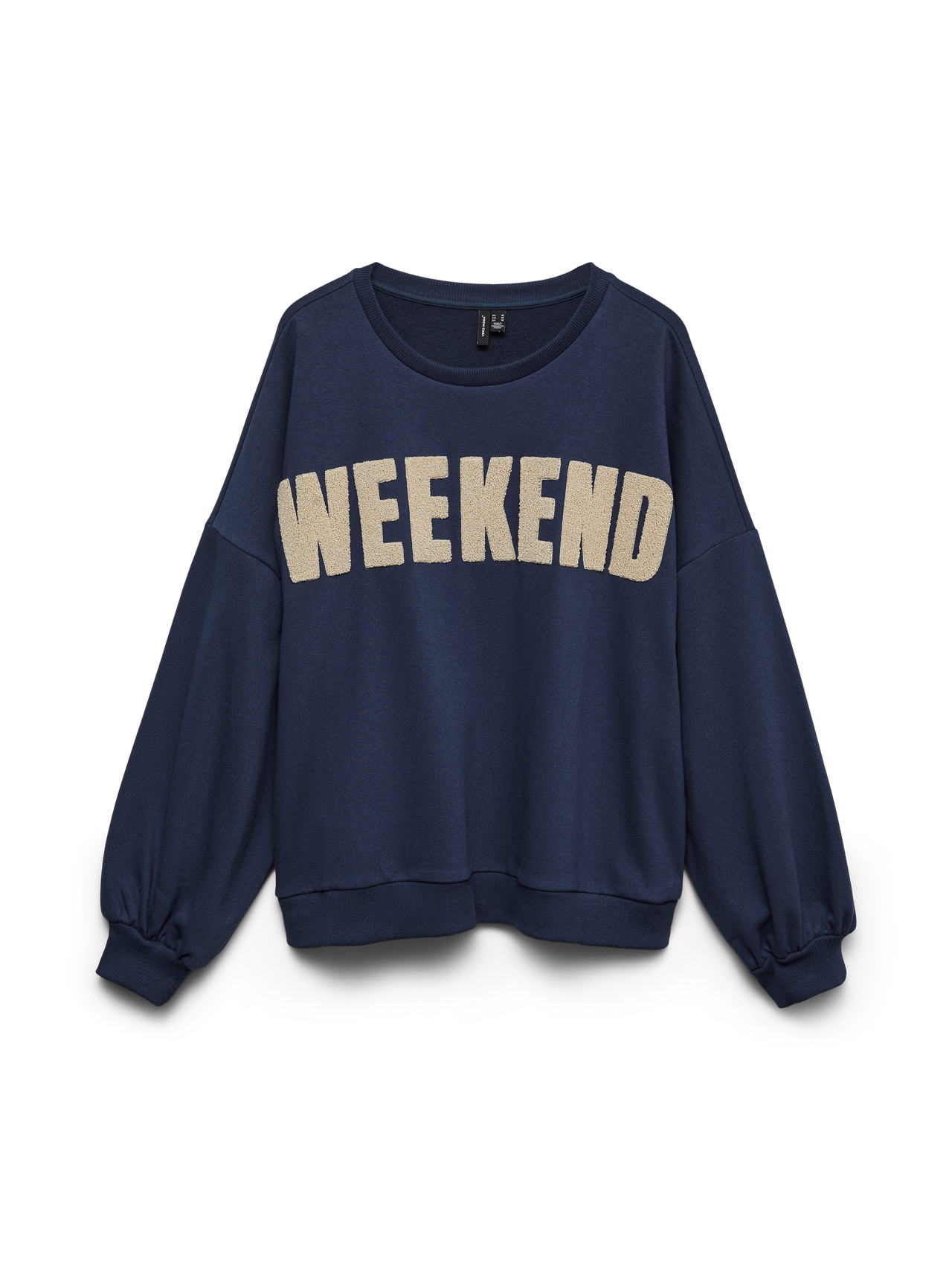 Deze moderne donkerblauwe trui, de Vero Moda Curve TRUI 10351895 in kleur Navy Blazer, is ontworpen met een casual uitstraling. De sweater heeft een klassieke ronde hals en lange mouwen die aan de onderzijde licht gepoft zijn door een elastische afwerking. Op de borst van deze comfortabele longsleeve staat de opvallende tekst 'WEEKEND' in een zacht aanvoelende, contrasterende textuur. Dit kledingstuk van Bestseller is speciaal ontworpen voor grotere maten, zodat jij altijd een casual en optimistische look creëert.Pasvorm en Stijladvies