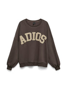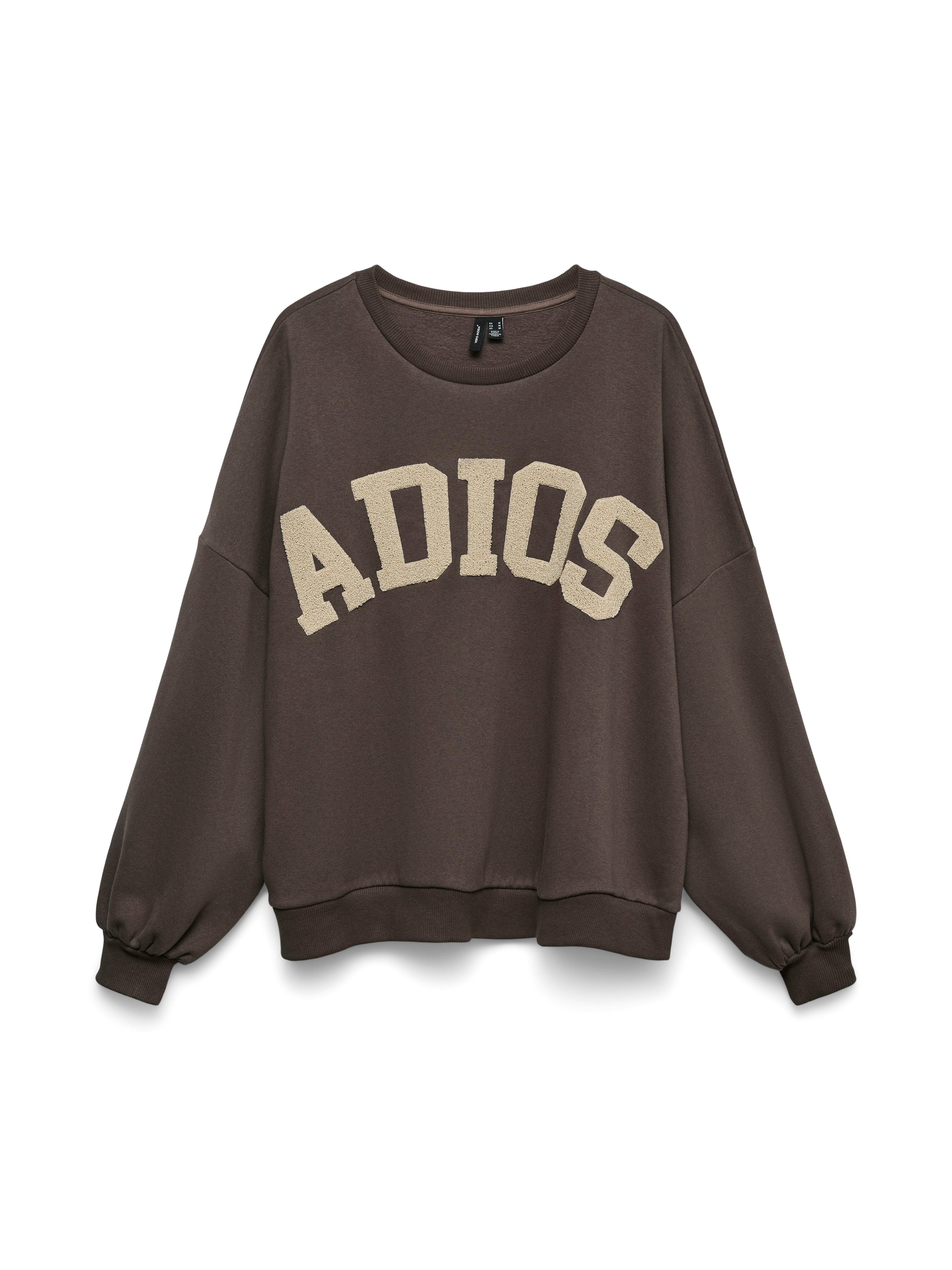 Deze Vero Moda Curve trui is uitgevoerd in de kleur Chocolate Torte. De trui met ronde hals heeft een regular fit en lange mouwen met een licht gepofte mouwinzet bij de schouder. De mouwuiteinden en de onderkant zijn voorzien van ribboorden. Op de borst vind je een gebogen opdruk met de tekst ‘ADIOS’ in een crèmekleurige, licht getextureerde stof. Dit casual sweatshirt is een comfortabele optie voor je dagelijkse looks.