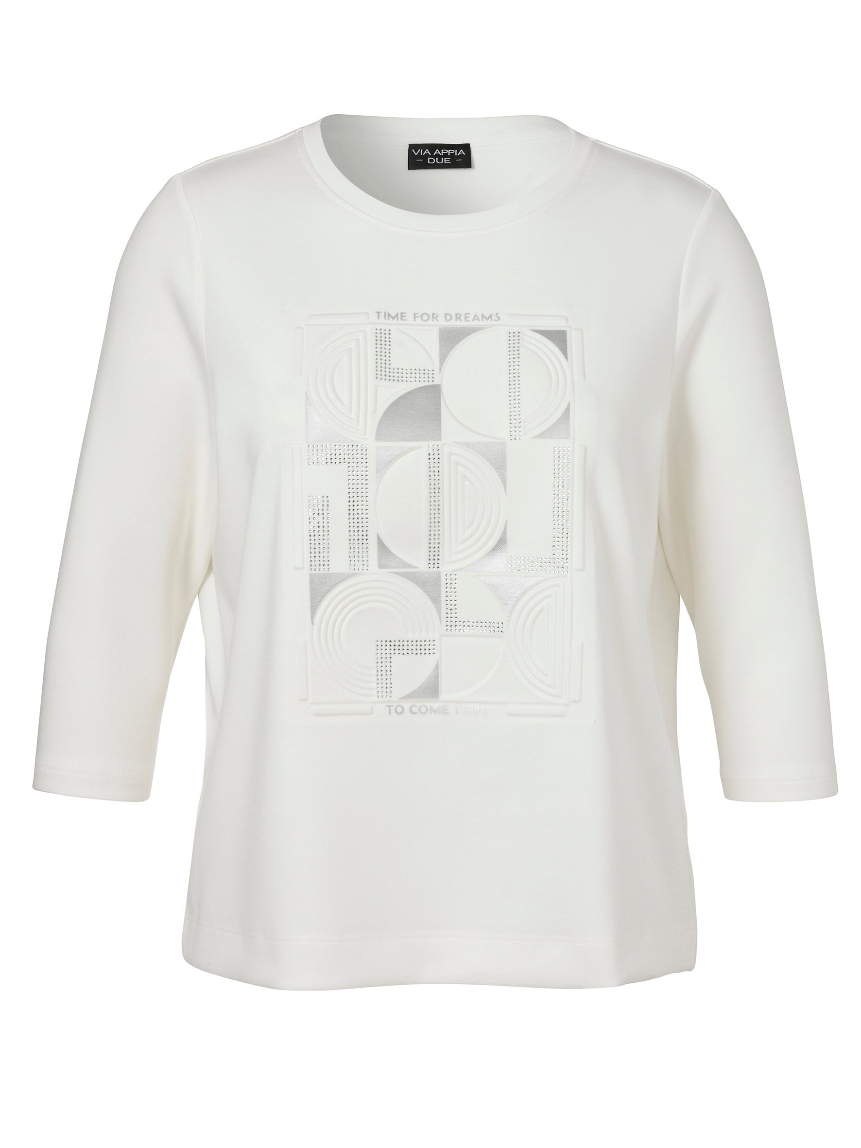 Deze casual ecru Via Appia Due trui is ontworpen met een klassieke ronde hals en driekwart mouwen. De damestrui heeft op de voorzijde een opvallende grafische print. Deze print combineert zilverkleurige strass steentjes met een subtiel reliëf, waarbij de tekst 'TIME FOR DREAMS' en 'TO COME TRUE' zichtbaar is. Deze comfortabele sweater van Via Appia Due is een veelzijdig kledingstuk dat je makkelijk combineert voor een optimistische look.