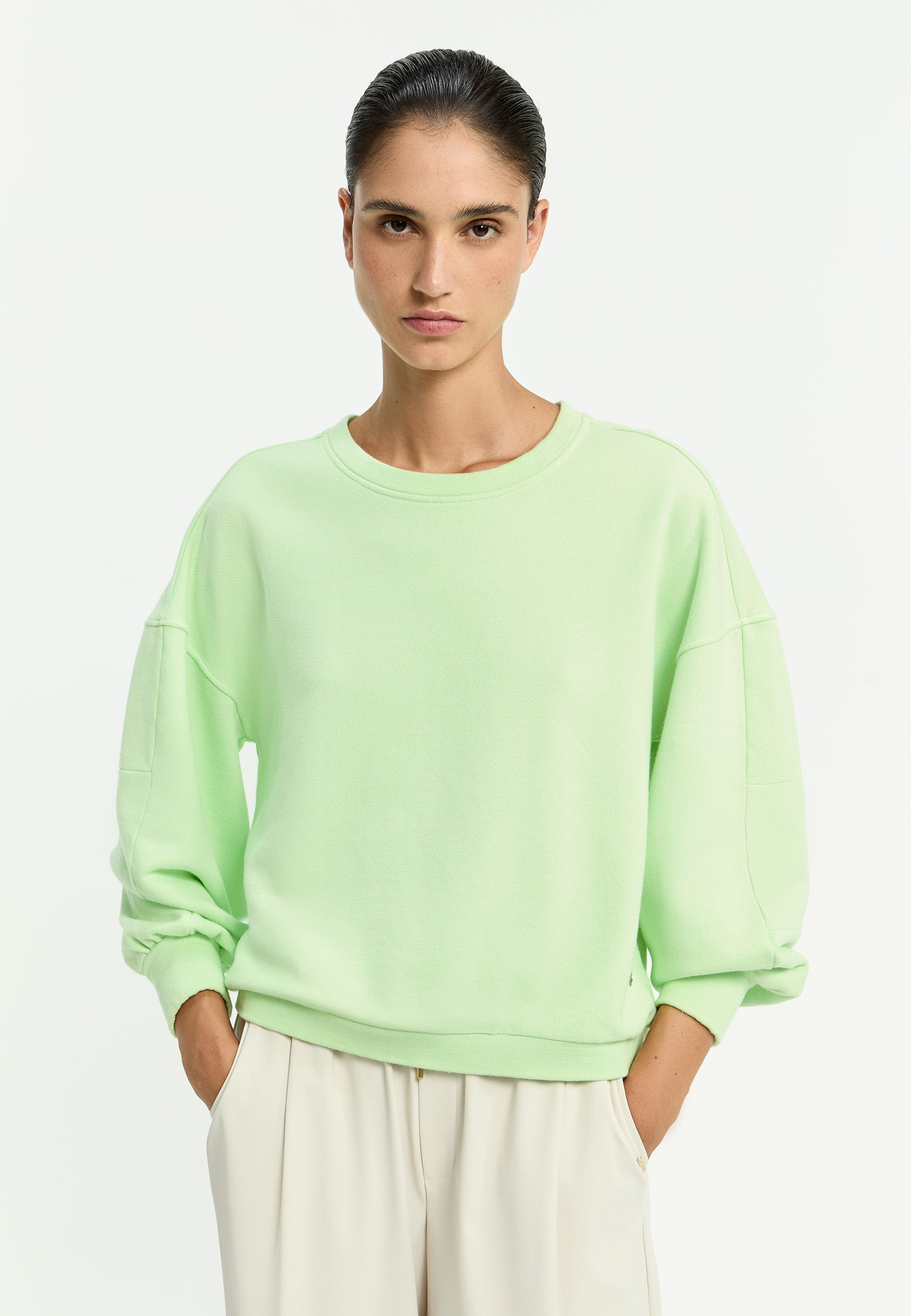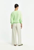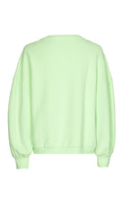 Deze Xandres trui is uitgevoerd in een lichte groene tint. De sweater is voorzien van een klassieke ronde hals en lange, licht volumineuze mouwen die eindigen in een brede manchet. Zichtbare stiknaden accentueren de panelen op de mouwen. Dit losvallende sweatshirt van Xandres heeft een elastische boord aan de onderzijde en is afgewerkt met een kleine metalen badge op de heupboord.