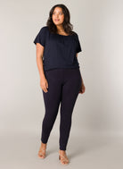 Dit model in curvy fit heeft een aangesloten pasvorm en een enkellengte. Door de donkerblauwe kleur is deze Base level curvy legging voor grote maten veelzijdig te combineren. Je draagt de stretchbroek makkelijk onder een lange blouse of een oversized tuniek voor een comfortabele alledaagse uitstraling. Ontdek meer casual items van Base level curvy om je look compleet te maken.